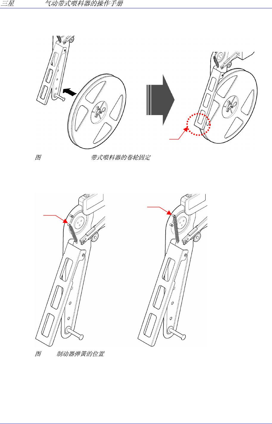 注意卷带方向如下图所示固定卷轮。 8mm带式喂料器使用料带卷盘制动器固定卷