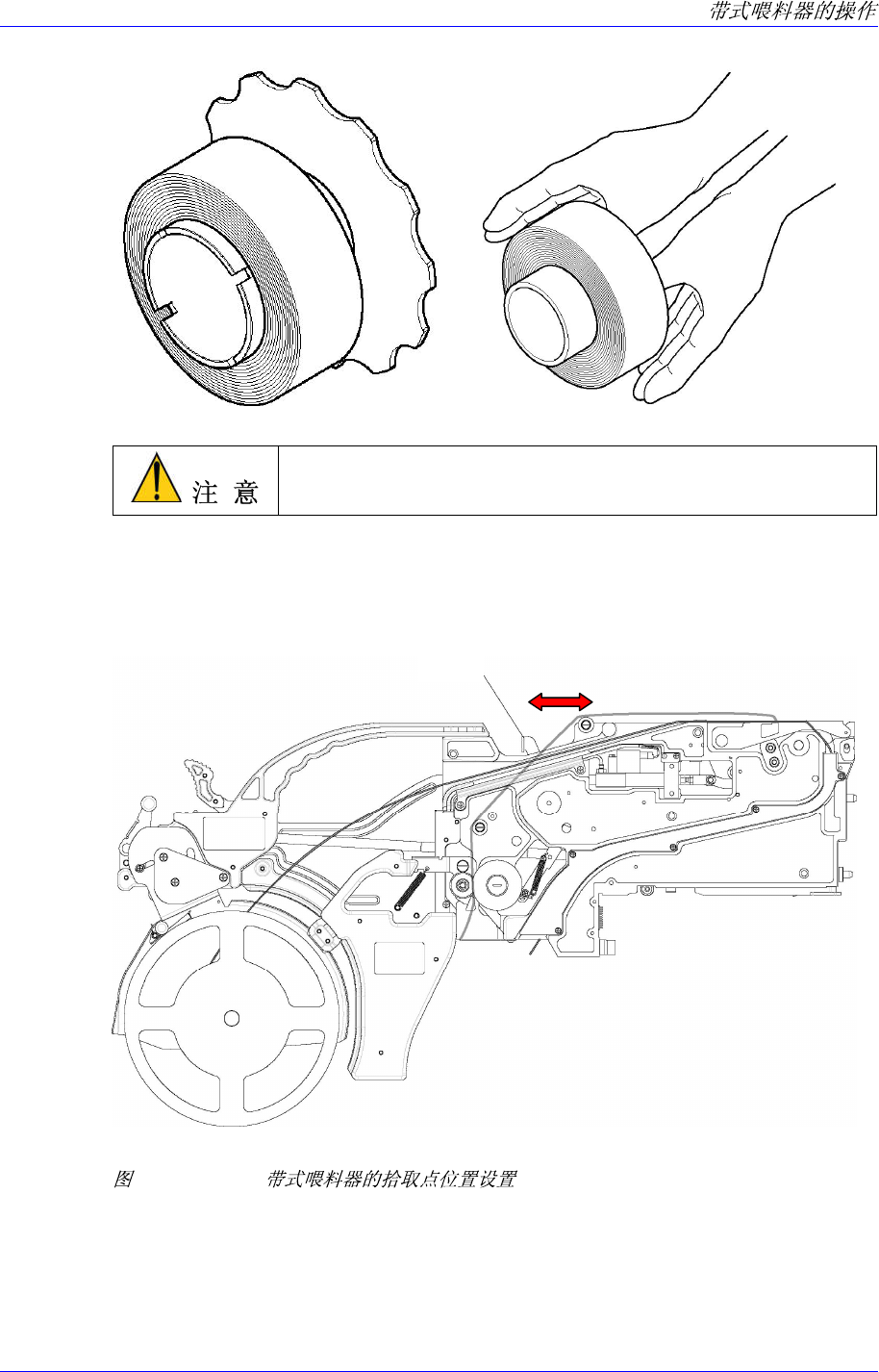 盖卷带贴装时,如下图所示注意料带的方向,使盖卷带的贴装面(紧贴于传输卷带