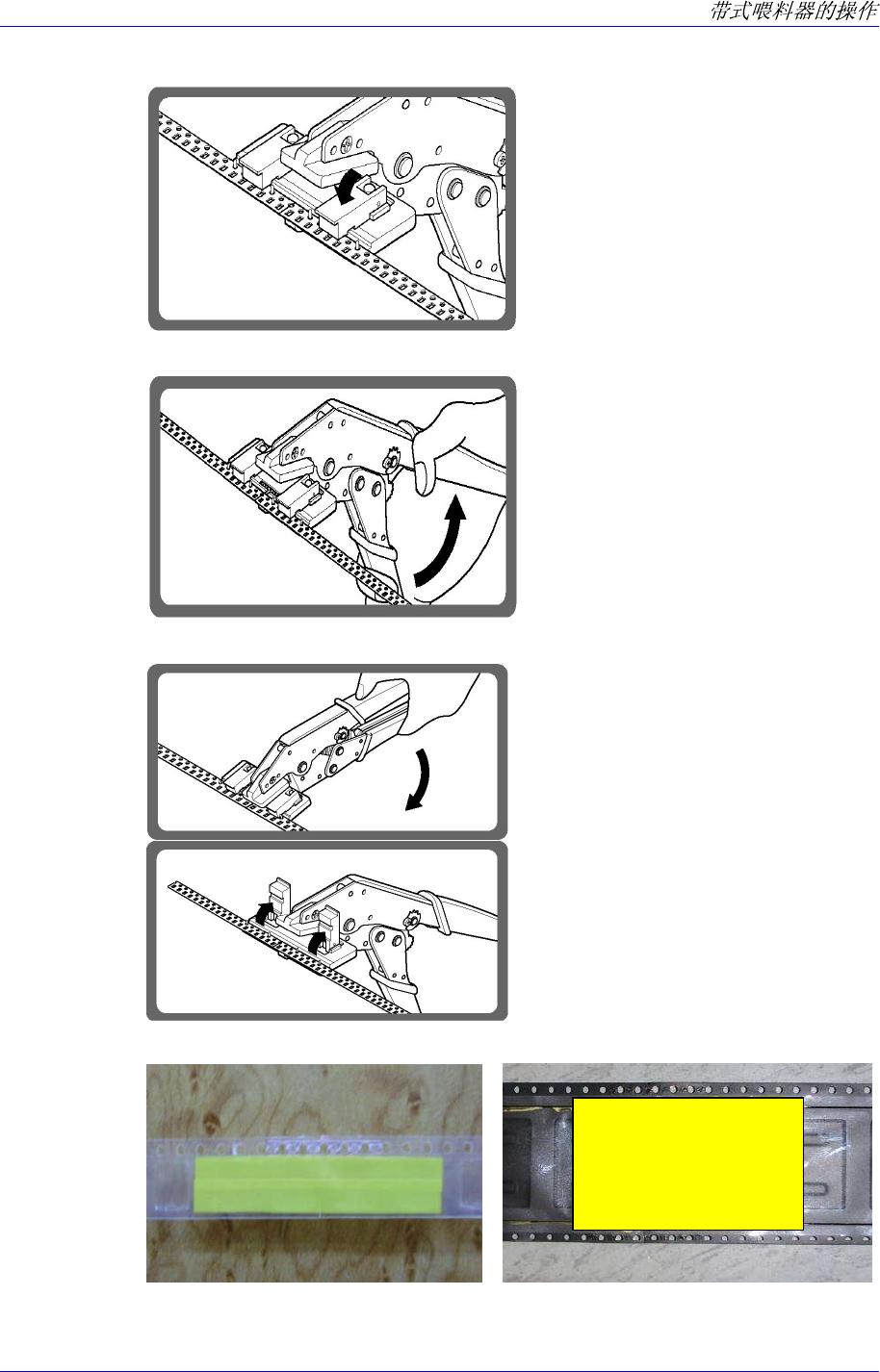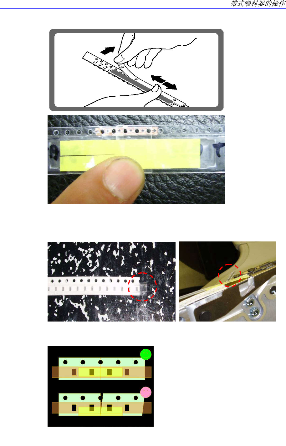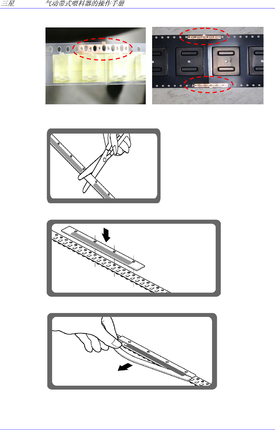 SM-Series [ 连接的状态 ( 胶带背面 ) ] 12, 16, 24mm T ape One –T ip 32, 44, 56, 72mm T wo - T ips 9. 用剪切塑料连接带。 10. 对准连接 T ape 的孔,在切断部位上放置乙烯连接料带。 ( 使用塑料连接带 Jig) 11. 从无孔部位开始揭开料带下方的粘贴面。 2-34