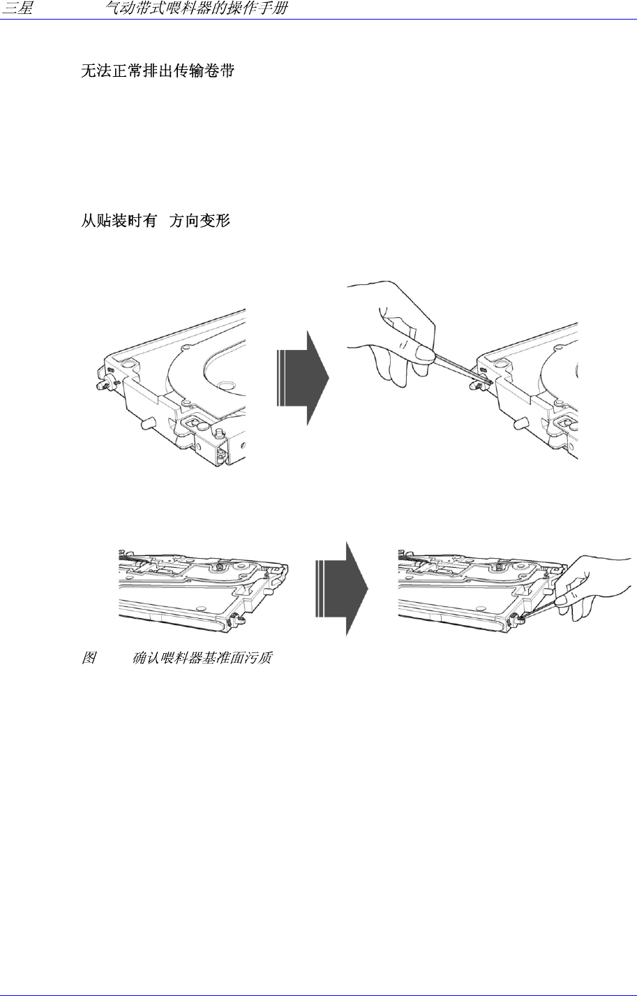 确认喂料器基准面是否粘有部件或污质。如果粘有部件或污质,请除去粘有污质或