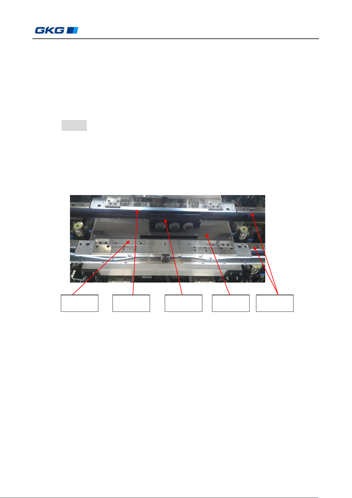 凯格精密机械有限公司 - 18 - 3. 4.3 印刷工 作平台 部分 3.4.3.1 工作平台 1) 用干净的棉布沾少许清洗液对顶销,支持块,工作平台进行清洁; 2) 对 X , Y1 , Y2 的感应器进行清洁; 小心: 不要使用有机溶液:氨水、苏打水或苯清洁传感器。 3) 取下工作台前盖板,用干净的棉布清洁导向杆及直线导轨; 4) 清洁并润滑直线导轨; 5) 步进马达要清洁润滑马达导程螺杆轴。 注意: 两运输导轨的平行度以及与工作…