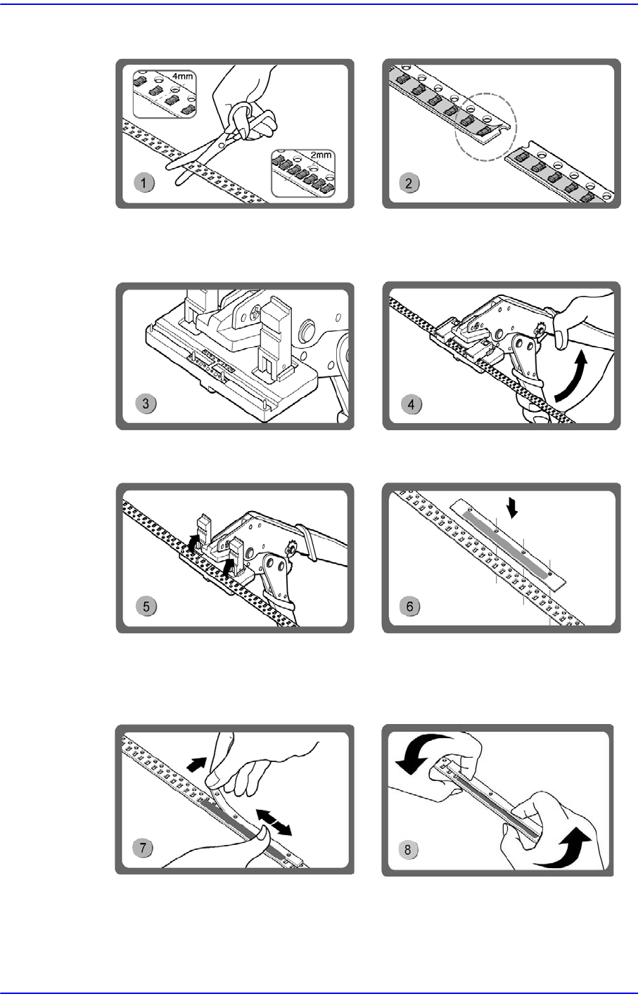 6-2 SM-Series SME DB Tape Feeder User's Manual 6.1.2. Tape Connecti on Method (Paper Type) Cut the end part o f the tape in use and the beginning p art of the new tape by using scissors. Peel off t he vinyl tape on …
