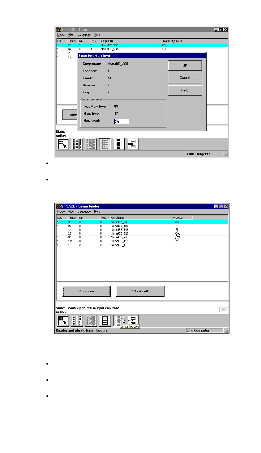 Meny "Display and vibrate linear feeder" (Visa och vibrera linjär matare)