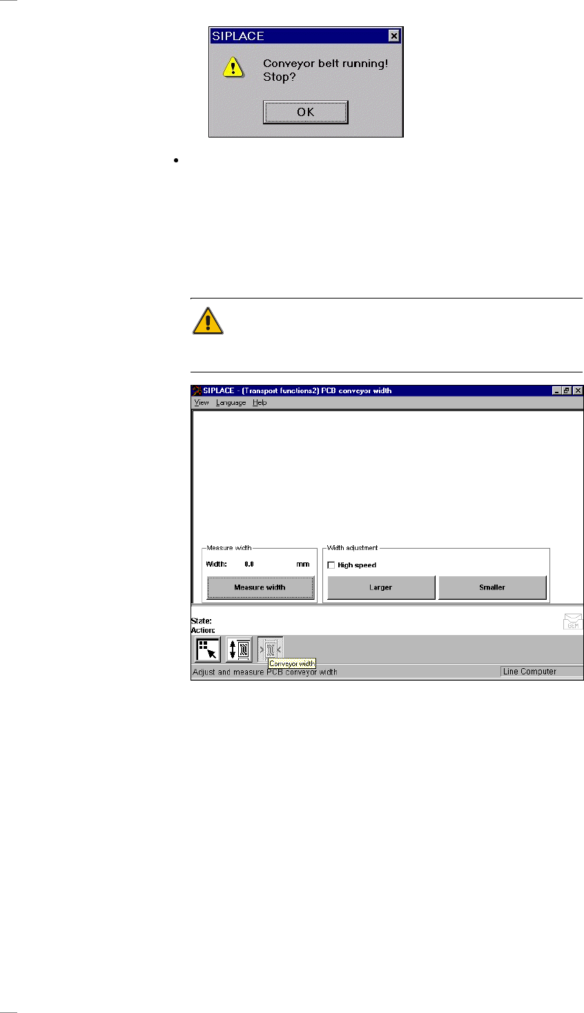 36 Klicka p å OK i dialogrutan f ö r att avsluta funktio nen. Meny "Con veyor wid th" (T ransport ö rbredd) ↑ SI 5.2.9 P å de n h ä r menyn k an du m ä ta oc h ä ndra transpor t ö rbredden. SE UPP! Kontrollera …