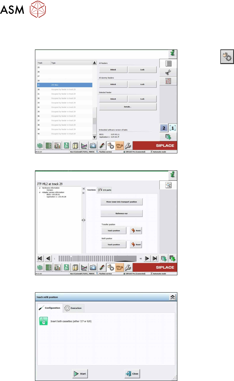 4 Setting up and commissioning 4.2 Retrofitting in the SIPLACE TX-Series User Manual / Bedienungsanleitung / 用户手册 SIPLACE TX V1/V2 Series JEDEC Tray Feeder (JTF-ML2) 11/2019 153 Fig.108: Teach refill position 4 ► Unlock…