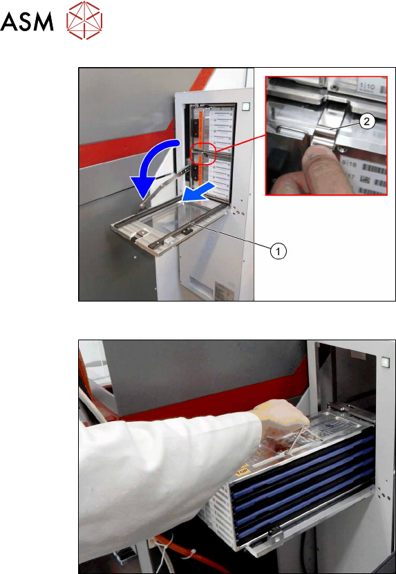 5 Tasks on the machine 5.2 Task: Operating the feeder 164 User Manual / Bedienungsanleitung / 用户手册 SIPLACE TX V1/V2 Series JEDEC Tray Feeder (JTF-ML2) 11/2019 Fig.130: Open Door ► Open the door (1) once the lift has re…