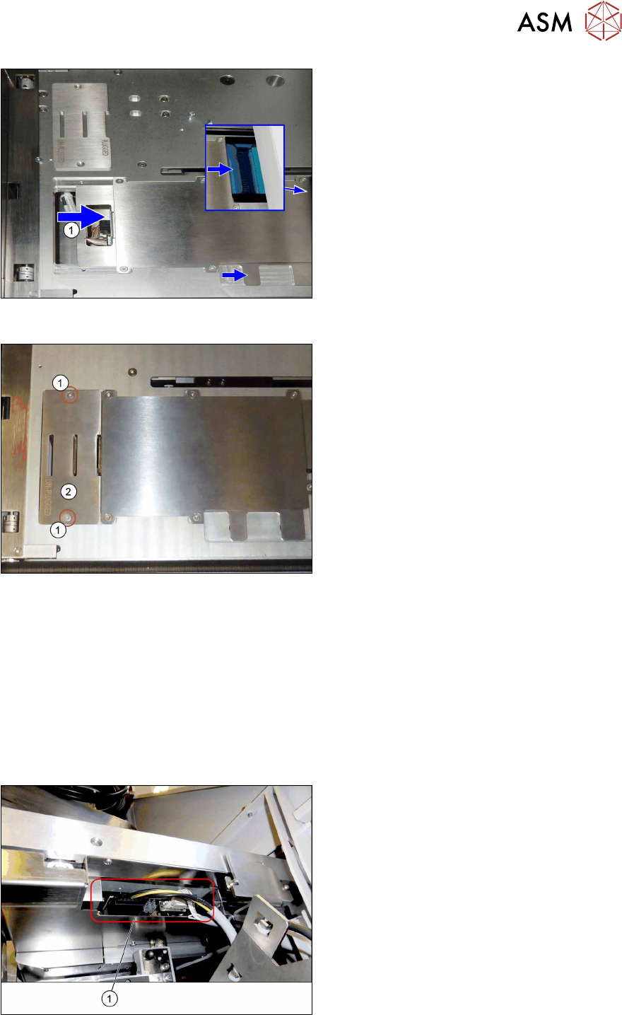 4 设置与调试 4.2 改造 SIPLACE TX 系列贴片机 234 User Manual / Bedienungsanleitung / 用户手册 SIPLACE TX V1/V2 Series JEDEC Tray Feeder (JTF-ML2) 11/2019 图89: 电缆敷设 ► 请将电缆 [03134469‑xx] 和 [03134468‑xx] (1) 正确敷设到传送导轨 上。应将电缆穿到固定支架 (2) 中。 …