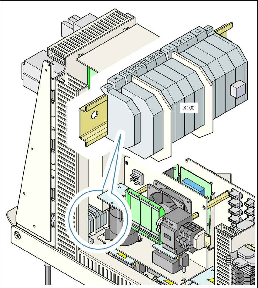 → Feed the power supply cable through the angled cable gland to the terminal panel X100 (see