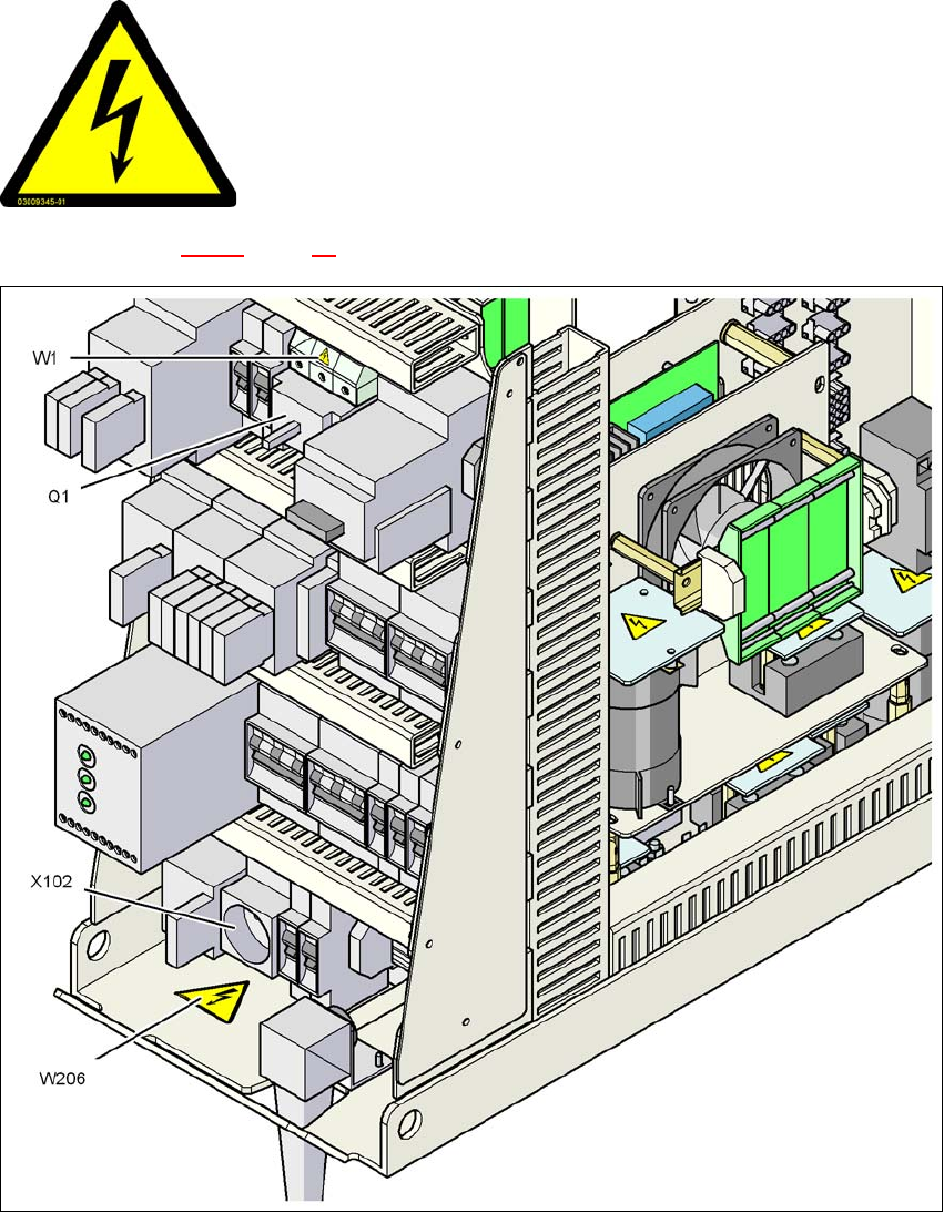 Fig. 2.2 - 8 Warning label W206 on service socket X102 and W1 on main power switch Q1