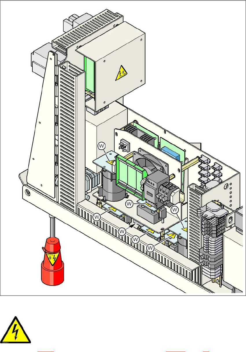 Fig. 2.2 - 10 Warning label W on the cover over the main power supply for the servo amplifier