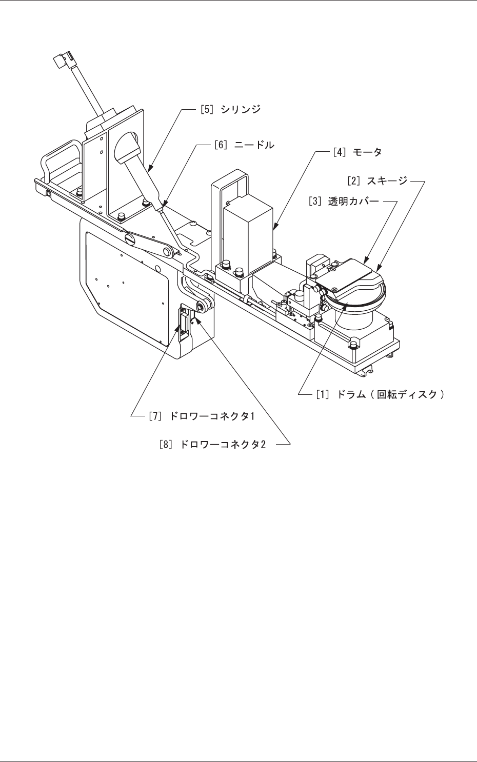 1-4 Tg1356-ID-SO 0609-003 1.3 各部の名称と機能 Fig.1 [1] ドラム ( 回転ディスク ) フラックス塗布位置です。 [2] スキージ フラックスの膜厚を均一にします。 [3] 透明カバー 防塵対策用の透明カバーです。 [4] モータ ドラム ( 回転ディスク ) を回転させます。 [5] シリンジ フラックスの供給を行います。 1.3 各部の名称と機能