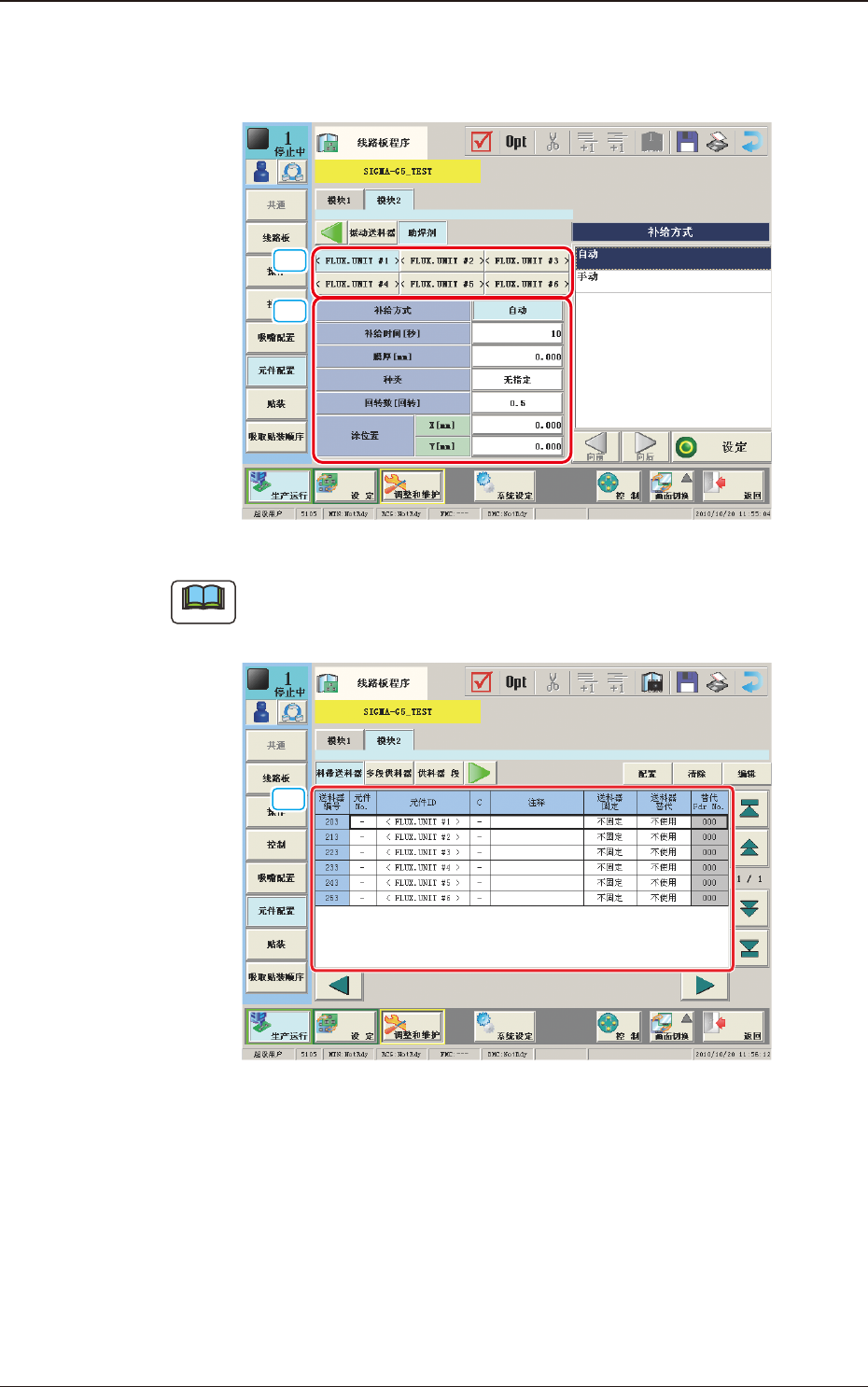 29 OM-1668 5.2 线路板程序 1010-001 [1] [< FLUX.UNIT #1 >] ~ [< FLUX.UNIT #6 >] 按钮 选择设定的助焊剂涂敷单元。 [2] 助焊剂单元编号 1~6 补给方式 选择助焊剂补给方式为 “ 手动 ” 或 “ 自动 ” 。 补给时间 [秒] 设定助焊剂补给时间。 膜厚 [mm] 设定膜厚度。 种类 设定在助焊剂涂敷单元中使用的助焊剂种类。 回转 数[回 转…