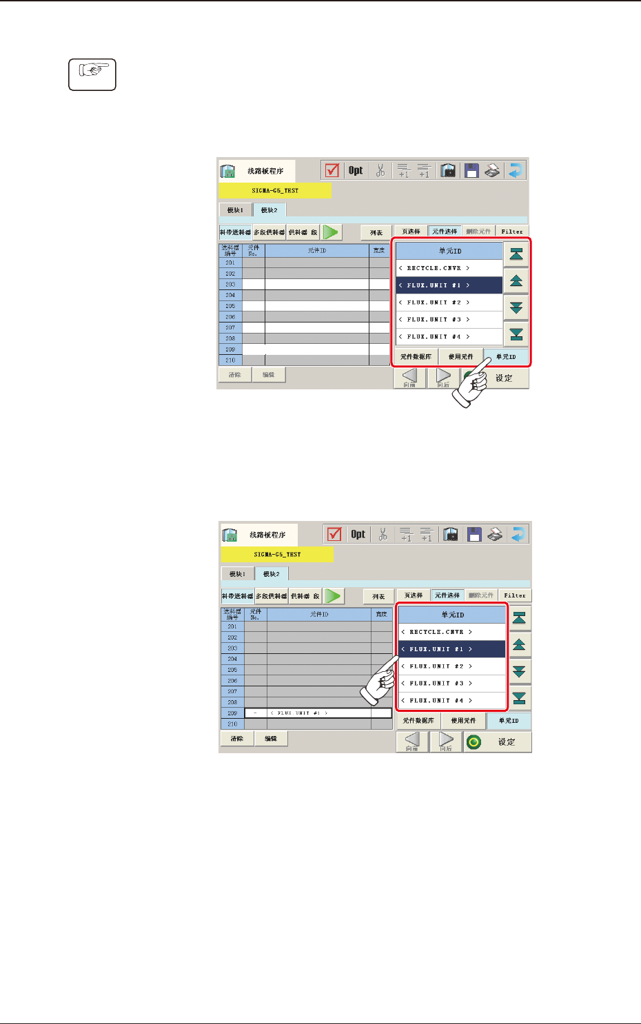 32 OM-1668 1010-001 元件配置数据设定步骤 Procedure (1) 选择配置助焊剂涂敷单元的模块,按下 [ 料带送料器 ( 带式送料器 )] 按钮后显示的 [ 配置 ] 按钮。 (2) 确认显示 “ 元件选择 ” 界面,按下 [ 单元 ID] 按钮。 F29 (3) 选择配置的 Fdr.No.,在 “ 单元 ID ” 选择界面,用 [<FLUXUNIT#1>] ~ [<FLUX…