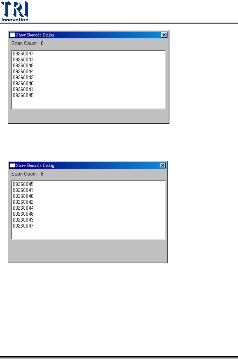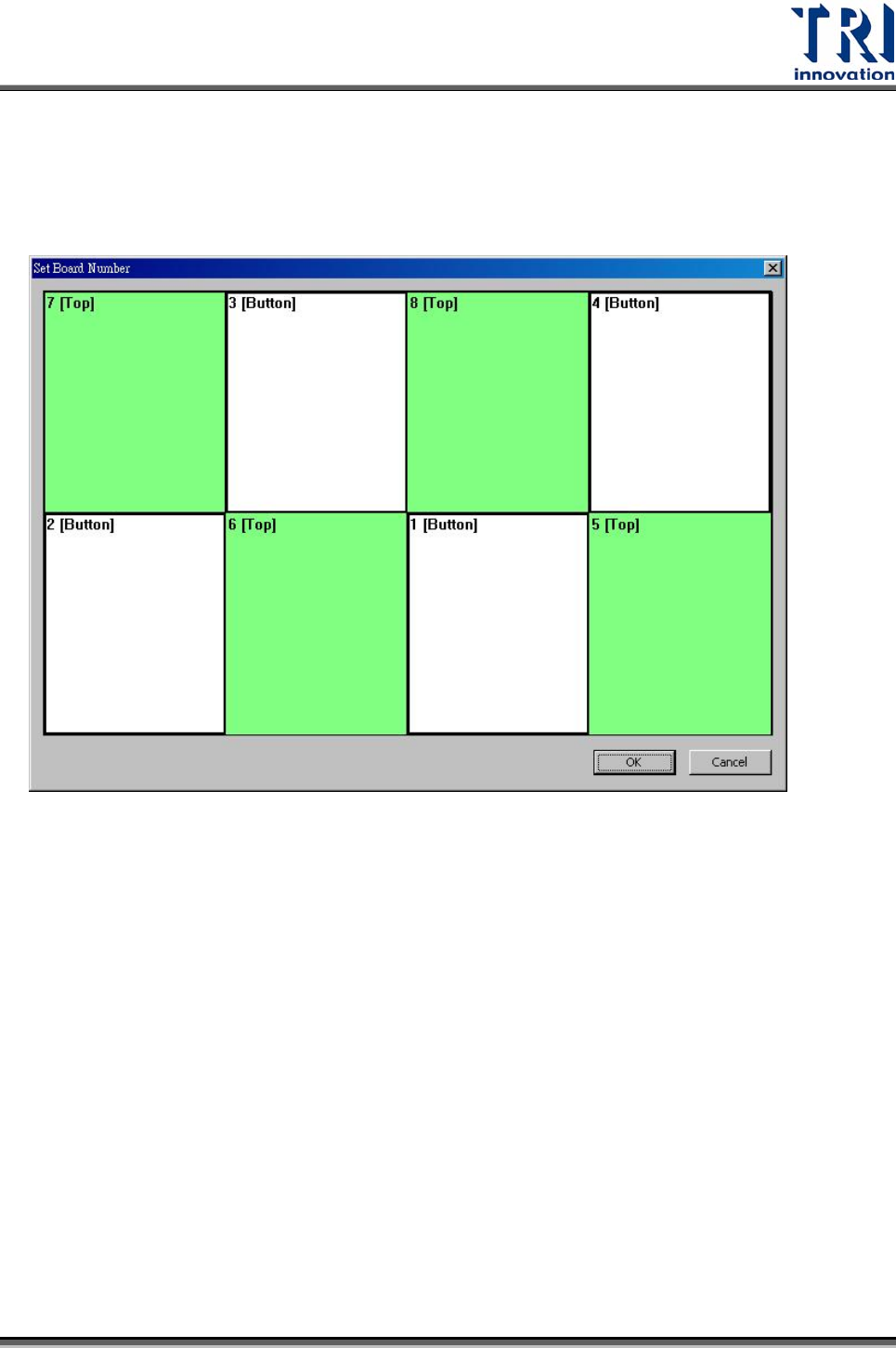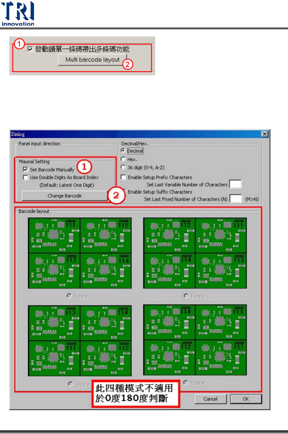 Test Research Inc.  TR7500SeriesUserGuide – Software 93 舉例說明 Step1. 開啟專案檔 Step2. 手動輸入每個板子的條碼尾數號 Step3. 硬體條碼器依序刷到 09260047, … Step4. 結果為下圖,因為刷到尾數為 7 的條碼是屬於第一列,故判斷待測板為 0 度。