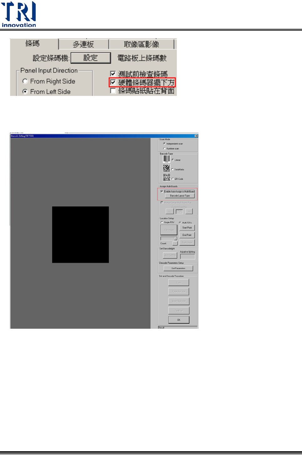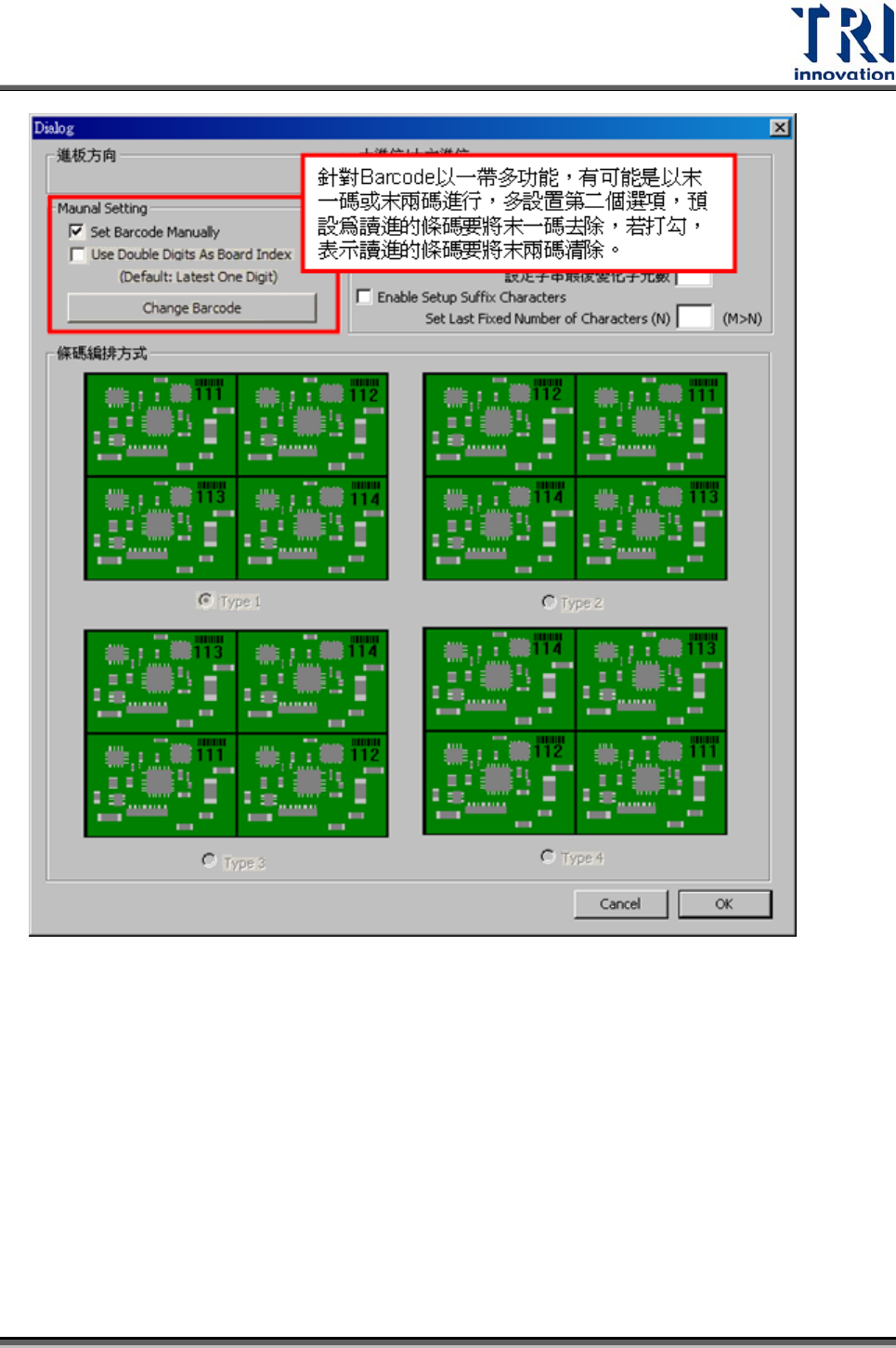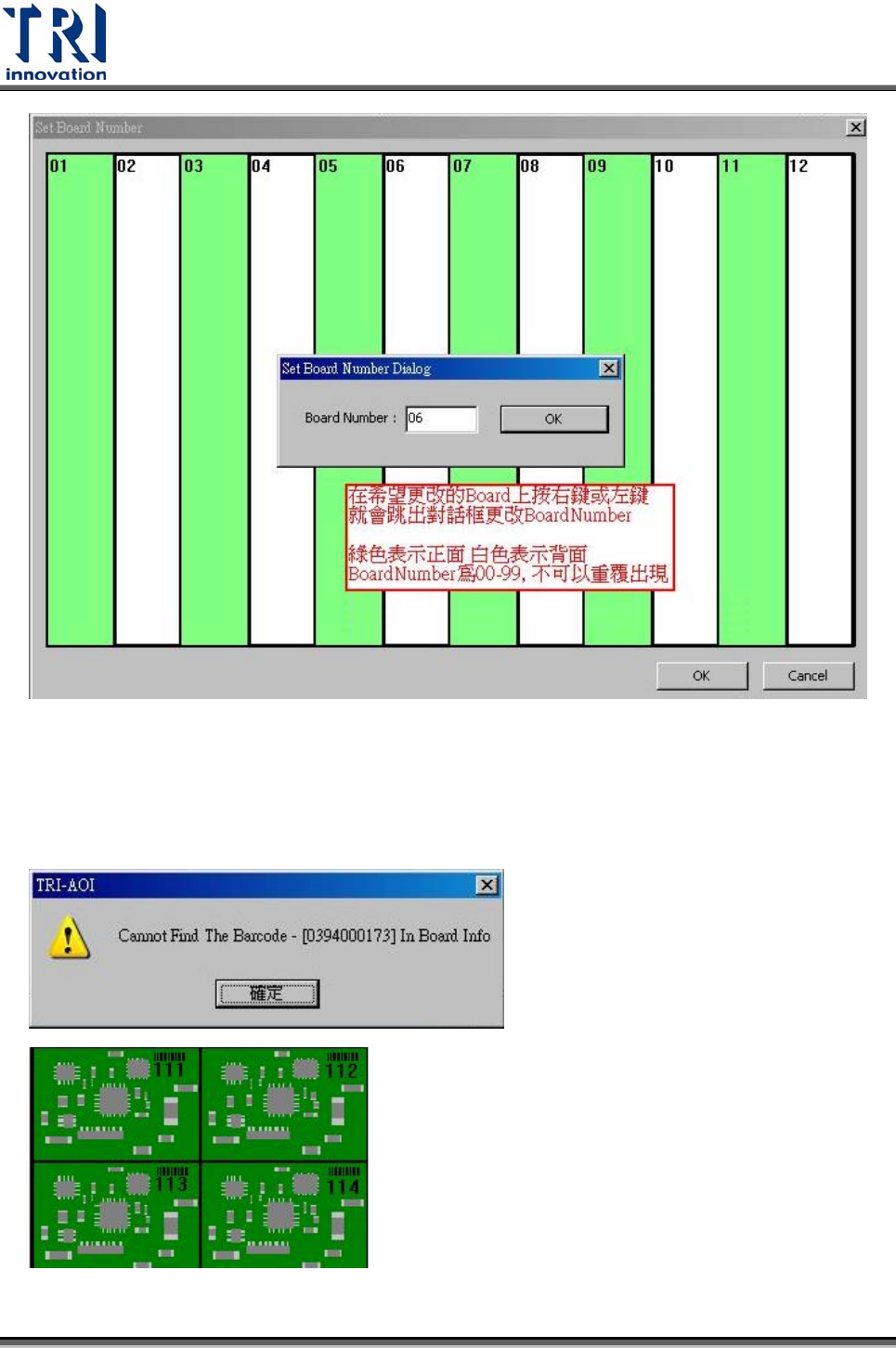 Test Research Inc. TR7500SeriesUserGuide – Software 89 Step3. 手動設定 Barcode Number ( 禁止輸入文字,空字串,重覆出現的末兩碼 )