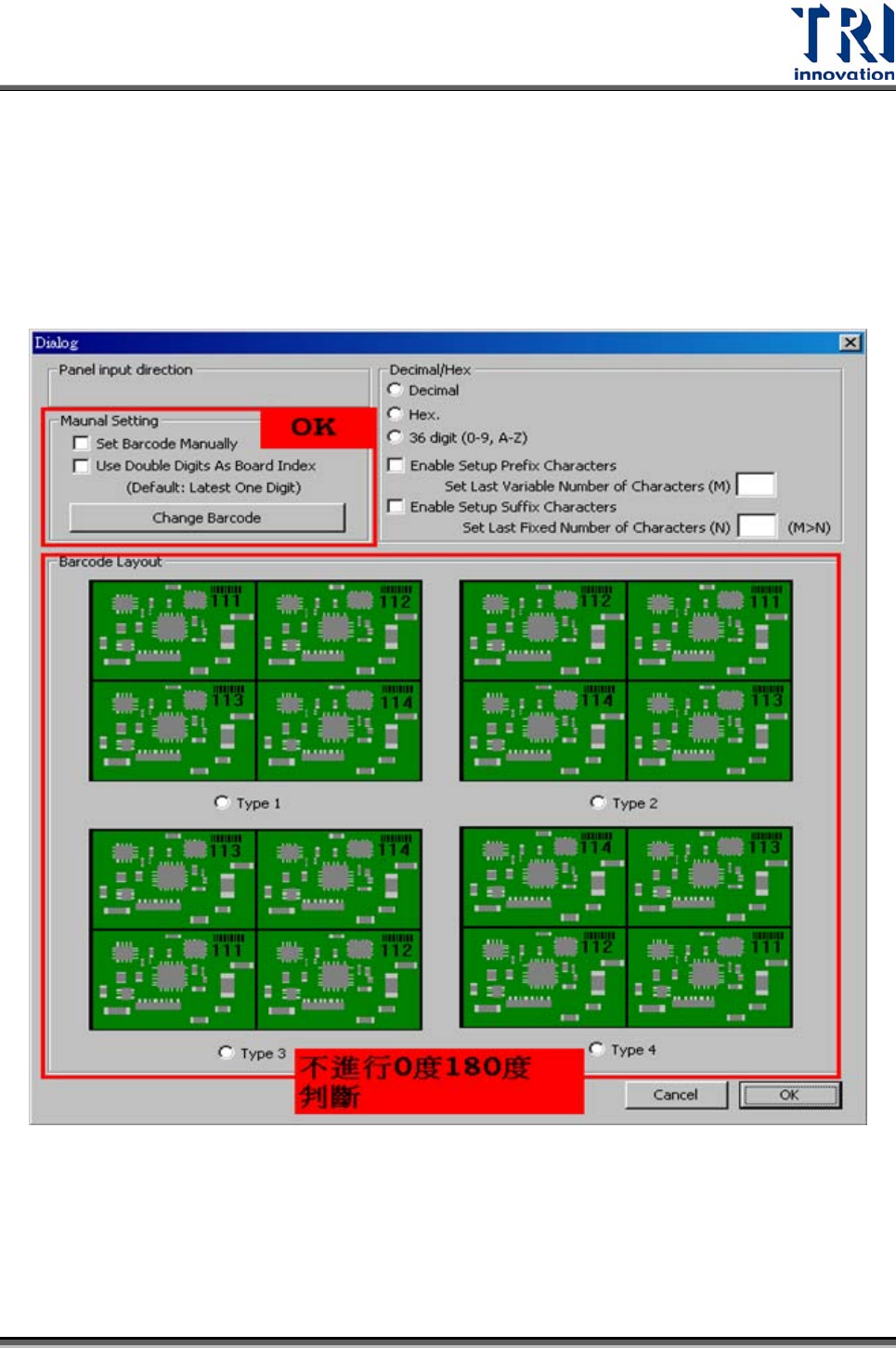 Test Research Inc. 92 TR7500SeriesUserGuide – Software Step2. 進版方向會影響 0 度 180 度判斷,所以要告知進版方向。以一帶多的模式 裡,只有手動設定條碼尾數號,才可以進行 0 度 180 度判斷。其他四種模式 均不會做判斷。