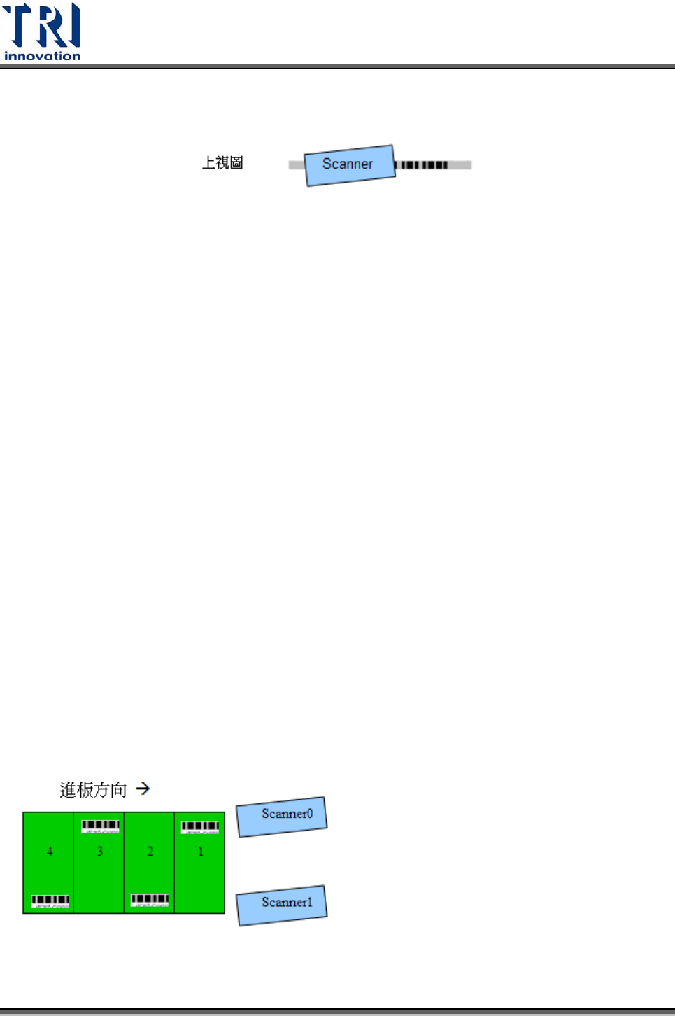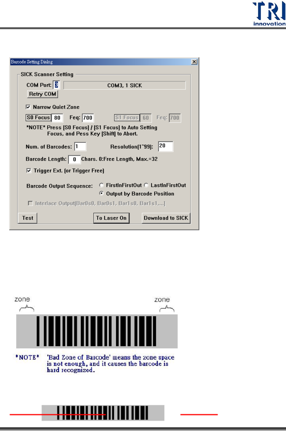 Test Research Inc. 96 TR7500SeriesUserGuide – Software Step4. 若條碼寬度極小,需將 Scanner 旋轉至一角度如下圖所示,可利於讀取。 Step5. 條碼位置確定後,按 [S0 Focus] ,維持條碼位置位置保持不動,讓 Scanner 自動讀取其焦距及頻率,完成後條碼發出嗶嗶聲,焦距及頻率數值也自動改 變。 Step6. 若為 Dual Barcode ,亦需…