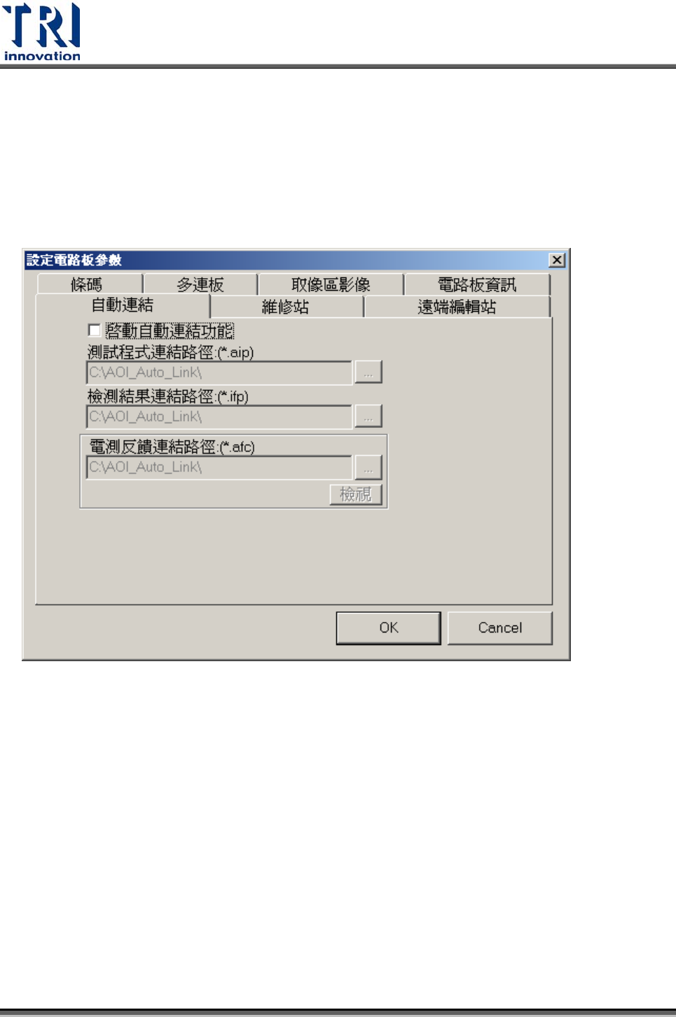 Test Research Inc. TR7500SeriesUserGuide – Software 101 3.3.3.5 維修站 (Repair Station) 路徑 – 指定維修站資料夾的路徑來存放檢測完畢的資料。正常情況下路徑應設為 [\\RepairPC\C\AOI_Repair_Data] 。 Change type to part number – 勾選表示在傳送資料至維修站時,以料號欄位取代 類…