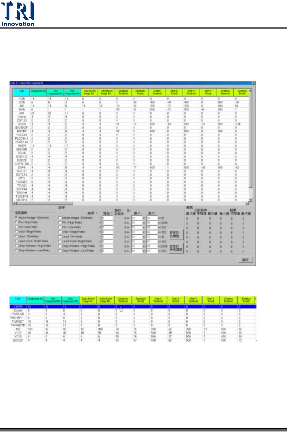 Test Research Inc. 132 TR7500SeriesUserGuide – Software 3.4.3.1 元件形式 (By Component Type) 依元件形式來設定比對條件,開啟後出現以下視窗。 在元件形式列表中,前四欄表示元件的基本資訊,接下來分別顯示各種檢測框的資 訊。可以在該形式元件之結果欄位上點選滑鼠左鍵兩下,可以編輯參數。