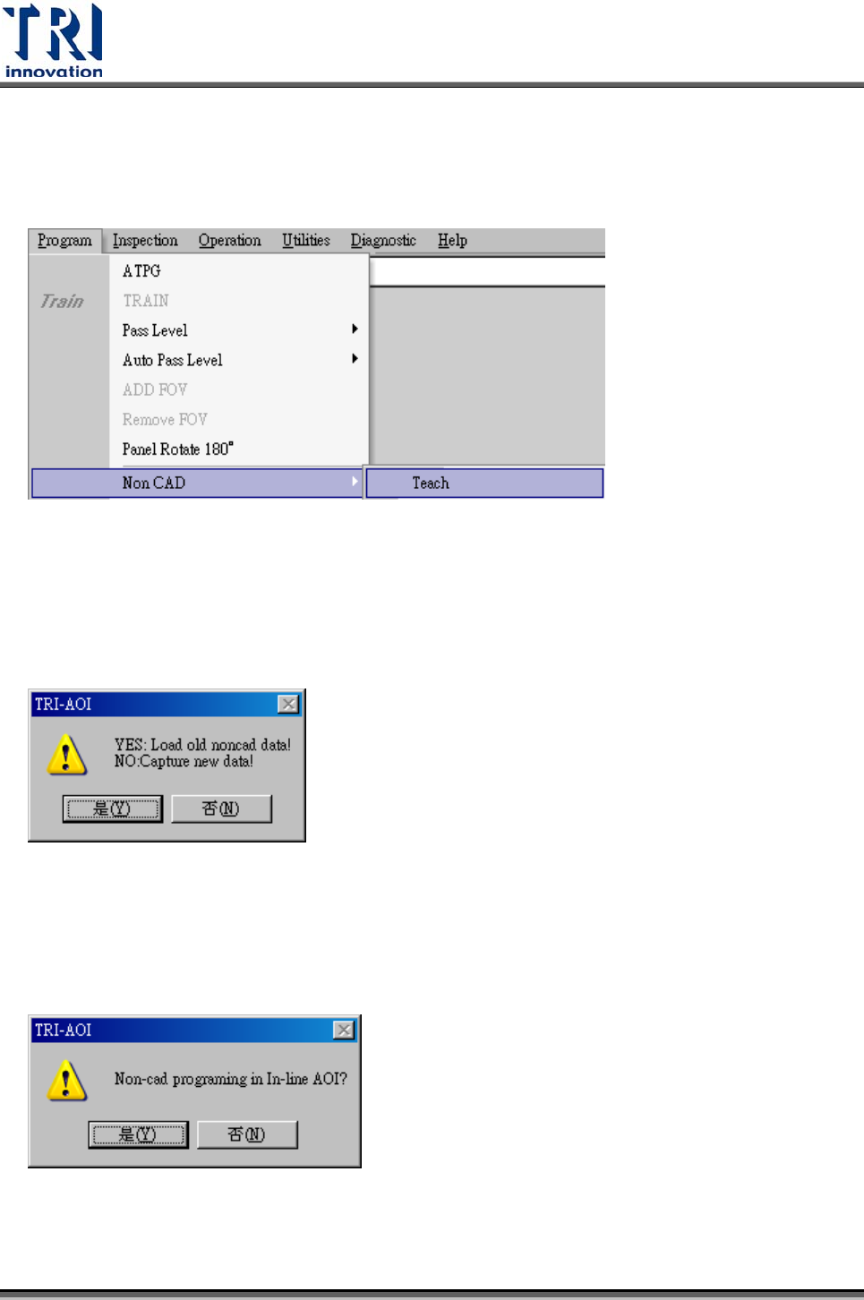 Test Research Inc. 166 TR7500SeriesUserGuide – Software Step1. 在登錄檔中新增 DWORD 參數 Newnoncad = 1 。 Step2. 重新開啟程式,選擇 [Program/ Non CAD/ Teach] 以開啟本功能。此功能只在 未載入專案 (*.pre) 時使用。 Step3. 系統出現以下視窗,按下按下 [ 是 ] 表示要載入之前抓取的影像進行編輯,…