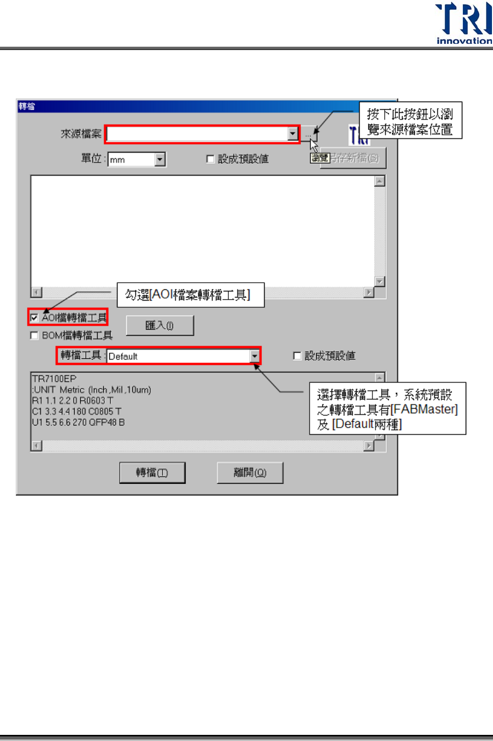 Test Research Inc. 6 TR7500SeriesUserGuide – Software 2.2 產生元件資料檔 在建立新程式時須將 CAD 檔案轉檔成為 AOI 機台可以使用的 AOI 檔案 (*.aoi) 。系統 目前有兩個預設轉檔程式,分別為 [FABMaster] 及 [Default] 。若原始的 CAD 檔案為 FABMaster 程式所轉出的 ASC 檔案 (parts.asc) ,可以使用 […