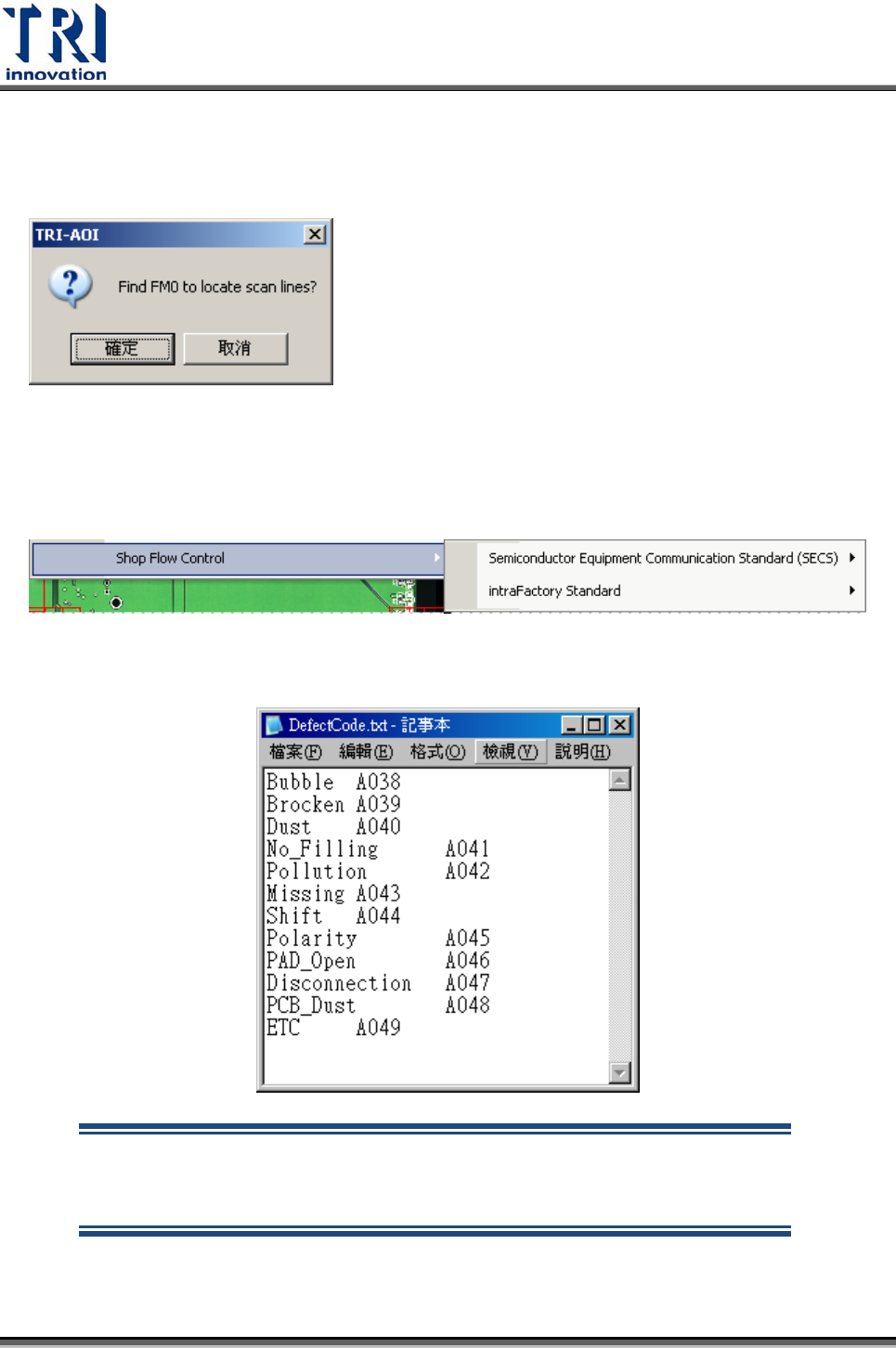 Step1. 建立文字檔名為[DefectCode.txt]位於路徑[C:\AOI\]中。文字檔案格式為