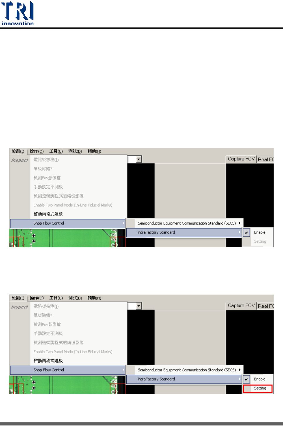 Test Research Inc. 182 TR7500SeriesUserGuide – Software z AOI 機台在檢測完畢後,輸出 TRI 格式的檢測結果 XML (TRI_SECS_InspectionData.xml) 到 C:\AOI\intraF \InspectionResultFiles 。 注意事項 請在註冊碼中,將 [COMPANYNAME] 設成 [INTRAF] 。 使用說明 Ste…
