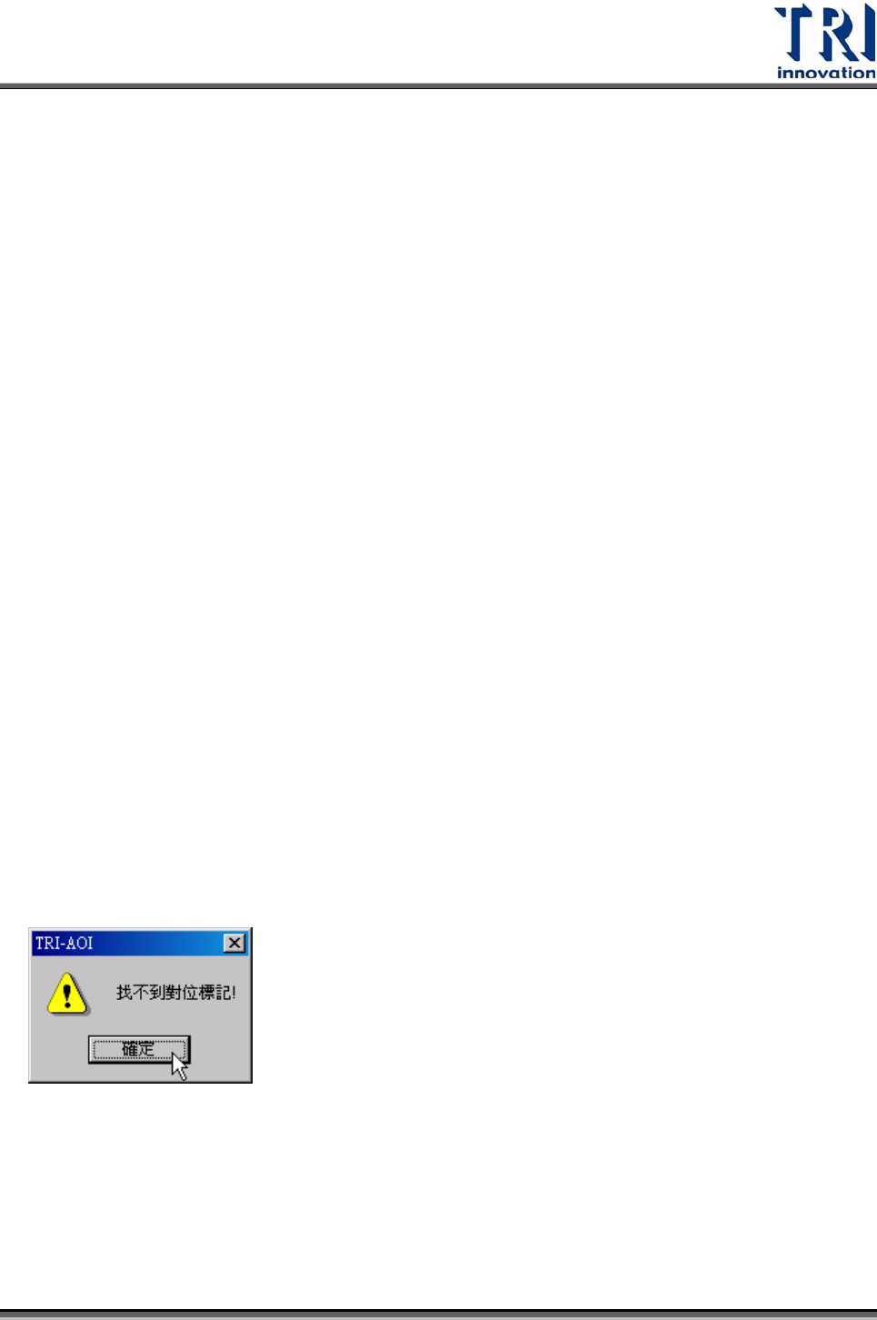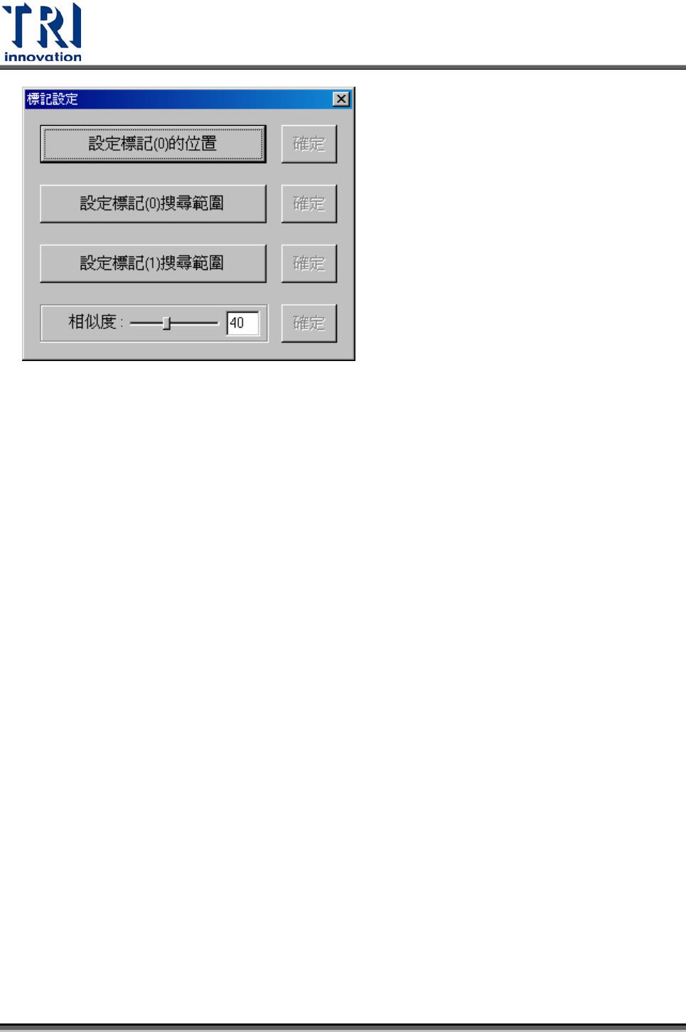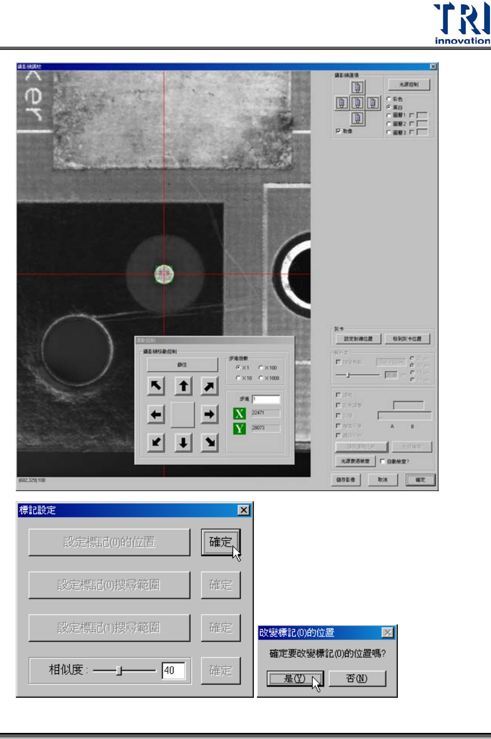 Test Research Inc. 192 TR7500SeriesUserGuide – Software 設定標記 (0) 的位置 – 將攝影機移動至標記 0 的上方後,按下 [ 確定 ] 鈕。接著按下 [ 標 記設定 ] 對話框上的 [ 確定按鈕 ] ,設定便完成。