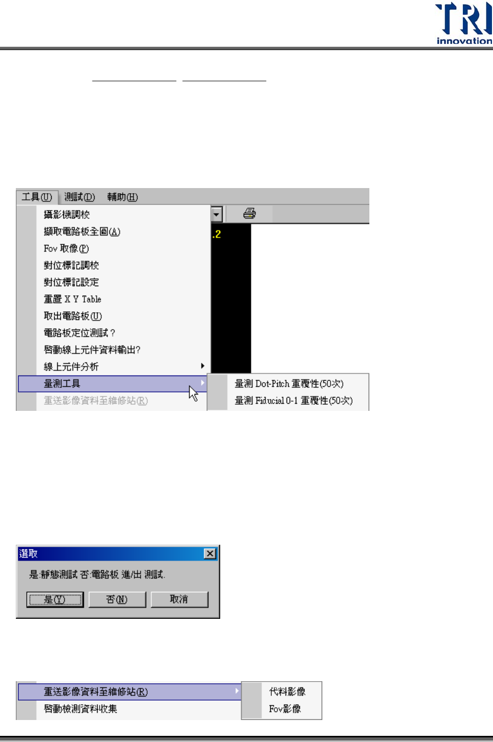 Test Research Inc. 204 TR7500SeriesUserGuide – Software 1) Alternative Image 只有在 [ 參數 / 使用者模式 / 連接維修站 ] 打勾時,此按鈕才有作用。按下此按鈕可以將維 修站需要的影像資料 ( 包含 *dir.1 、 *.win 、 *.img 、 *.bmp) 再傳送一次到維修站電腦中, 路徑為使用者在 [ 參數 / 使用者模式 / 電路板 /…