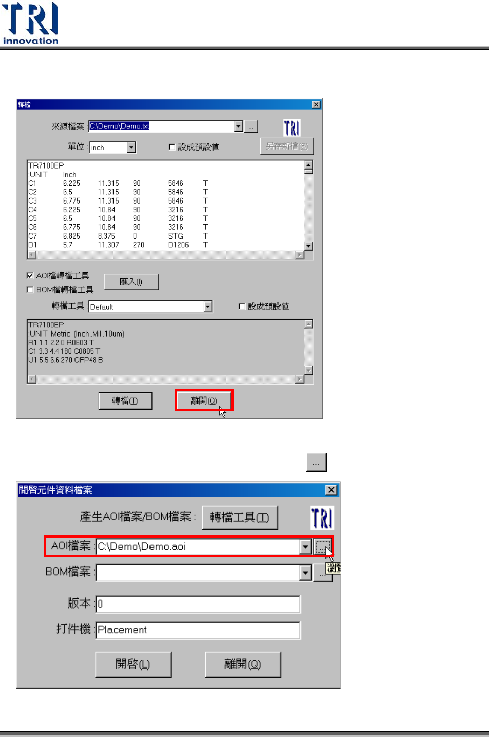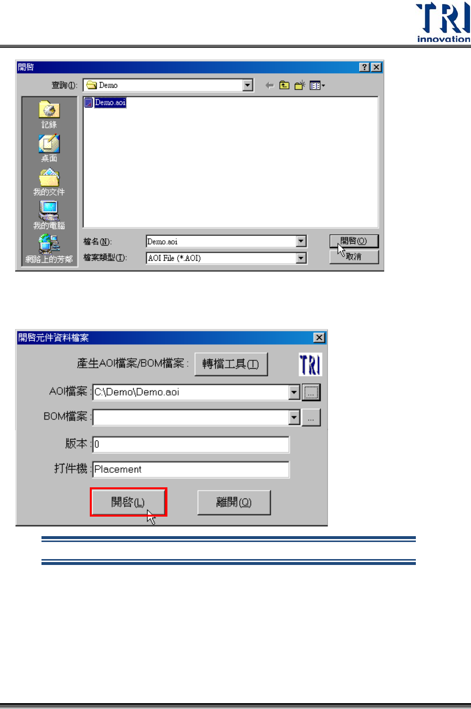 Test Research Inc. TR7500SeriesUserGuide – Software 13 9) 開啟 AOI 檔案 關於 [ 轉檔工具 ] 將在 4.1.2 詳細說明。