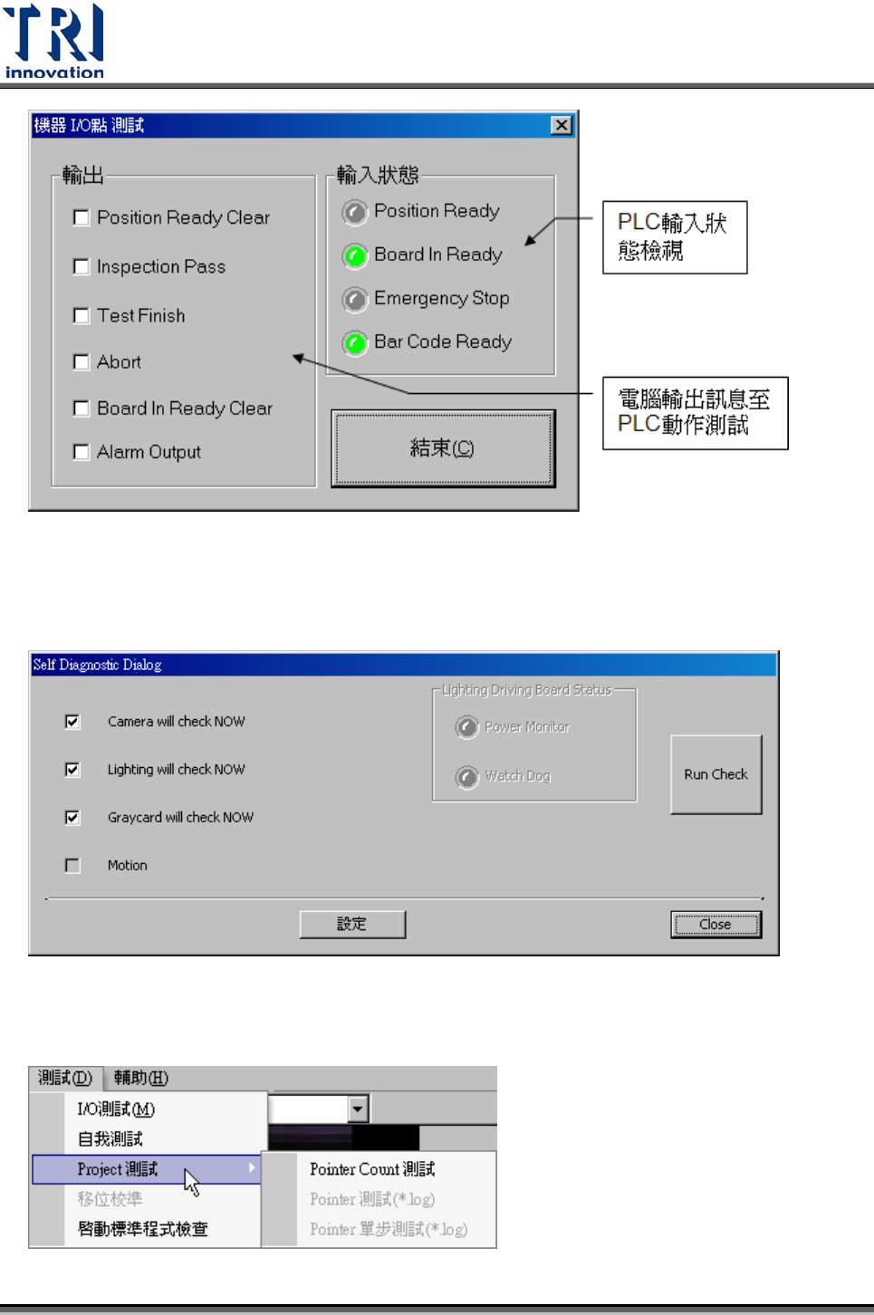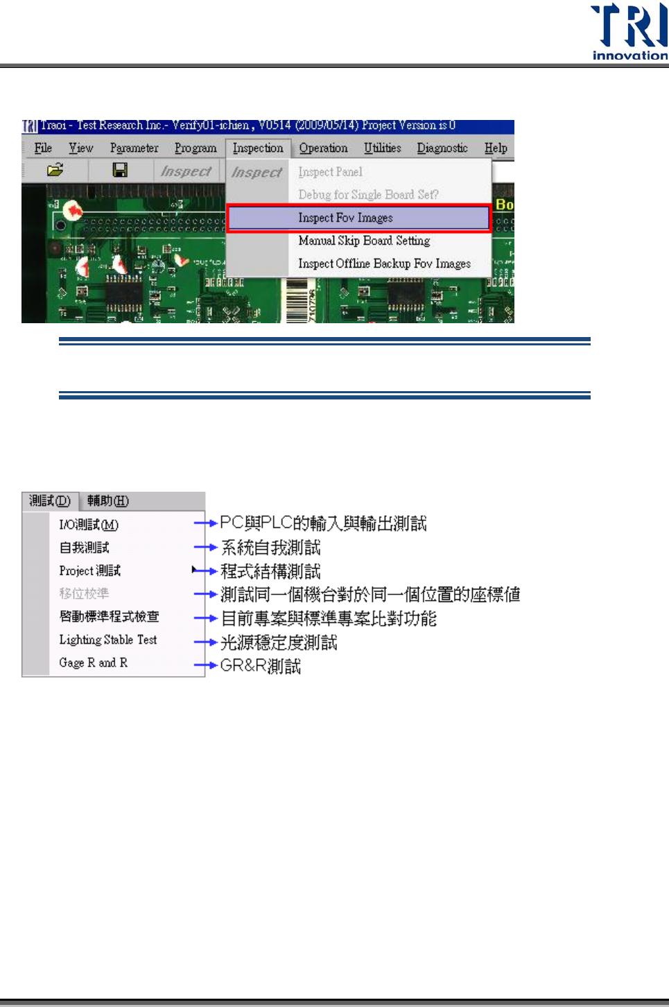 Test Research Inc. 250 TR7500SeriesUserGuide – Software 3.8.2 自我測試 (S ELF D IAGNOSIS ) 可進行多項系統自我測試。 3.8.3 P ROJECT 測試 (P ROJECT T EST )