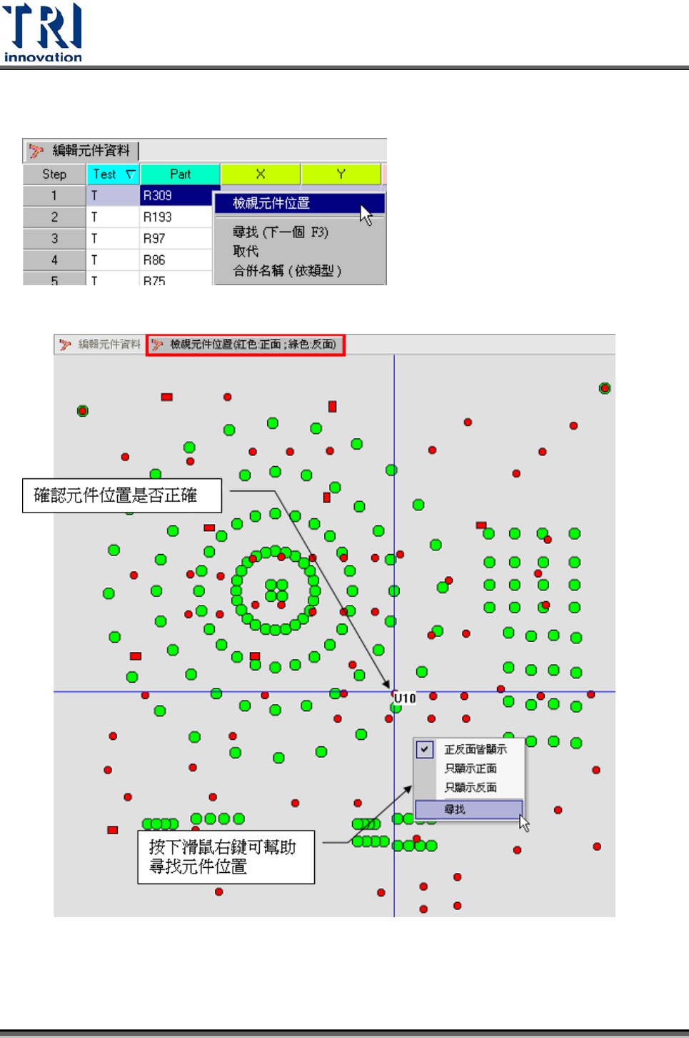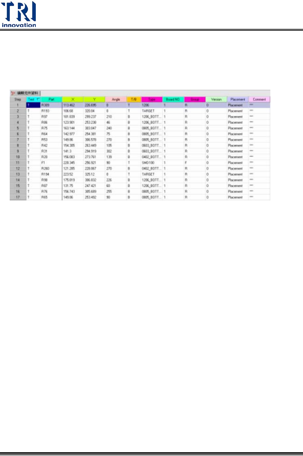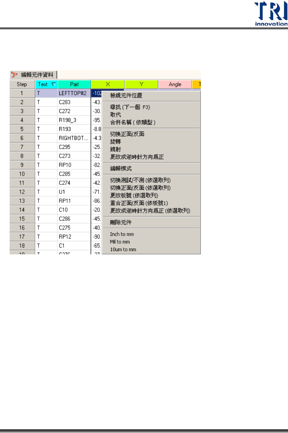 Test Research Inc. TR7500SeriesUserGuide – Software 15 2) 在元件資料表區域按下滑鼠右鍵,會出現編輯資料表之工具列。可利用這些工具 將元件資料進行編輯,直到資料符合實際資料為止。若為待測板為多連板則需將 此元件資料編輯成與左上角之機板資料一致即可。