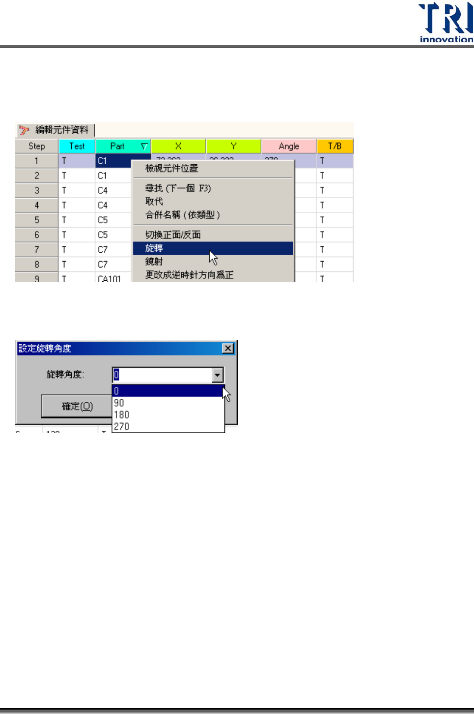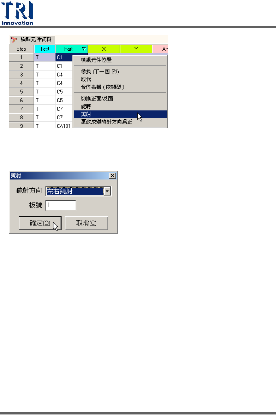 Test Research Inc. TR7500SeriesUserGuide – Software 275 4.2.6 旋轉 (R OTATE ) 將整片電路板依指定的角度 (0 度 ~360 度 ) 旋轉。 可以從下拉式選單中選擇角度或自行輸入特殊角度,輸入後按下 [ 確定 ] 即可。 4.2.7 鏡射 (M IRROR ) 此功能可以將整片電路板以上下或左右方向進行鏡射。 左右鏡射 – 以板子的正中央之縱軸為準…