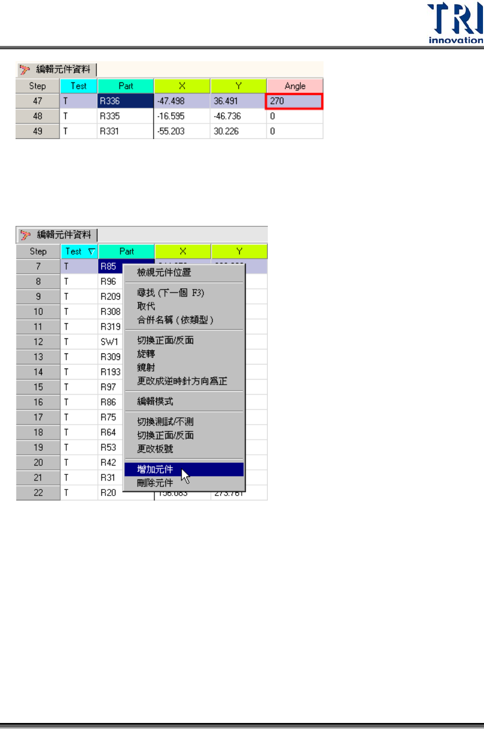 Test Research Inc. 284 TR7500SeriesUserGuide – Software 4.2.16 刪除元件 (D ELETE ) 此功能可刪除元件資料表上的元件,可選取一個或一次選取多個刪除。 若選取刪除單個元件,則系統出現以下視窗,確認無誤後請按下 [ 確定 ] 刪除此元件。 若一次選取多個元件進行刪除動作,則系統出現以下視窗,確認無誤後請按下 [ 確定 ] 來 刪除所有選取的元件。