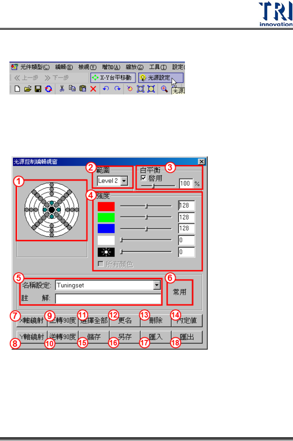 按下[光源設定]按鈕會出現[光源控制編輯視窗],在本程式中若需更改光元都須經由此