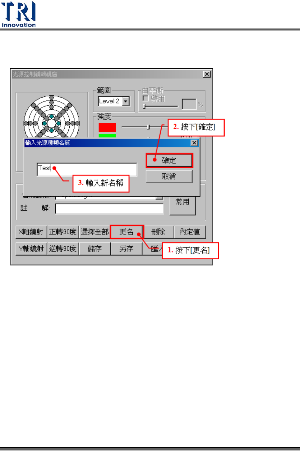 Test Research Inc. 304 TR7500SeriesUserGuide – Software 13) 更名 (Rename) – 按下可改變目前所選擇的燈光名稱