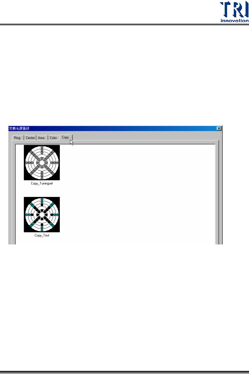 Test Research Inc. 306 TR7500SeriesUserGuide – Software 4.8.2 特殊光源設定 檢測時會使用到的光源即為按下 [Normal] 按鈕後所顯示的 13 種燈光,包含尋找第一 定位點的燈光 [Fiducial0] 、尋找第二定位點的燈光 [Fiducial1] 、擷取大圖影像的 [Maplight] 、製作程式時上方攝影機的兩種預設燈光 [ToplightA] 、 [T…
