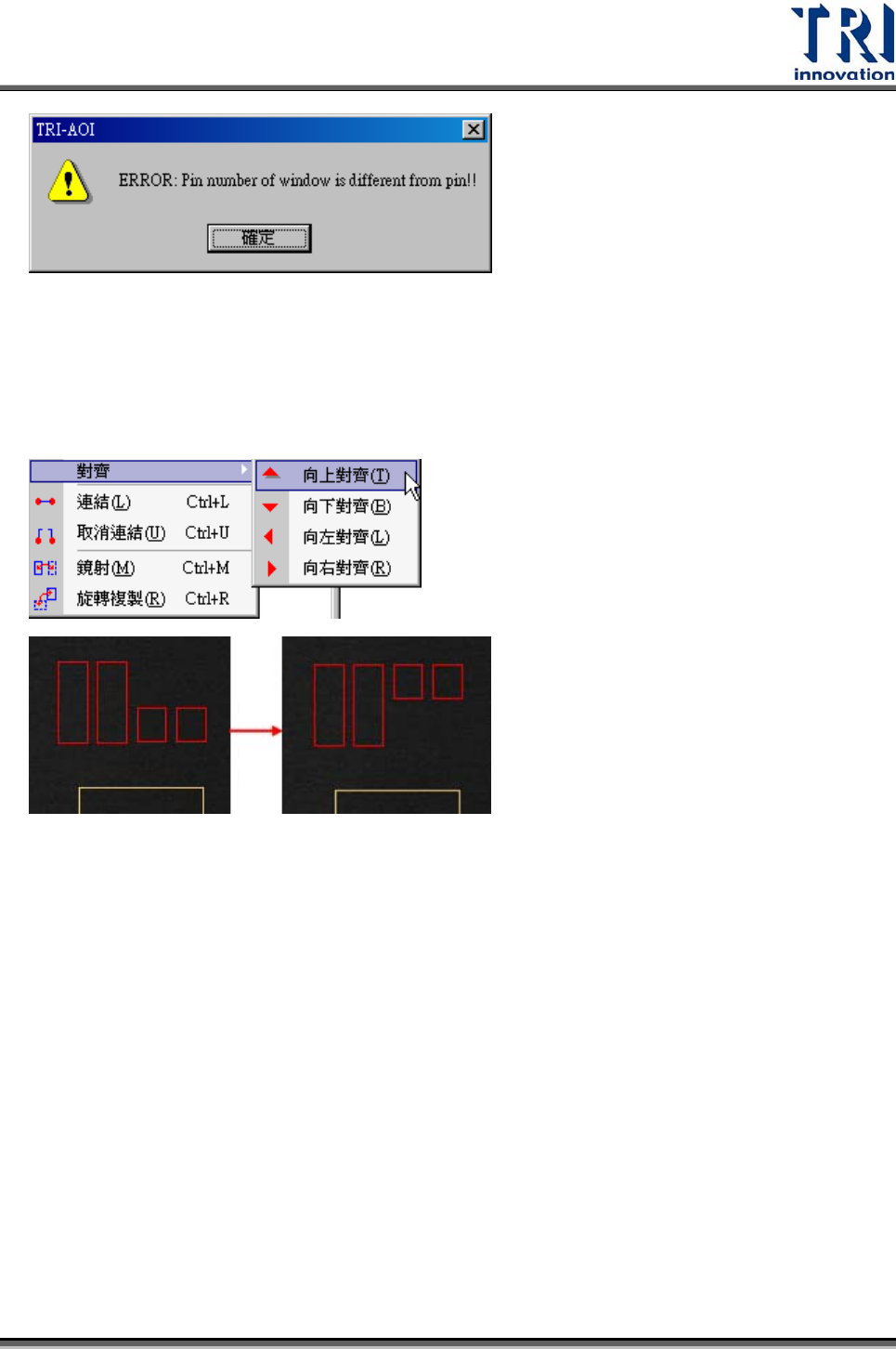 Test Research Inc. 318 TR7500SeriesUserGuide – Software 4.9.3 編輯 4.9.3.1 拷貝到全部的腳 (Copy to all pins) 須先選擇一個 [Pin] 框,以及與其相連接且欲複製的檢測框,接著按下本按鈕,則會將 選擇的檢測框複製到其他腳位上。若選擇的檢測框與 [Pin] 框沒有連結,則會出現以下 警告訊息。