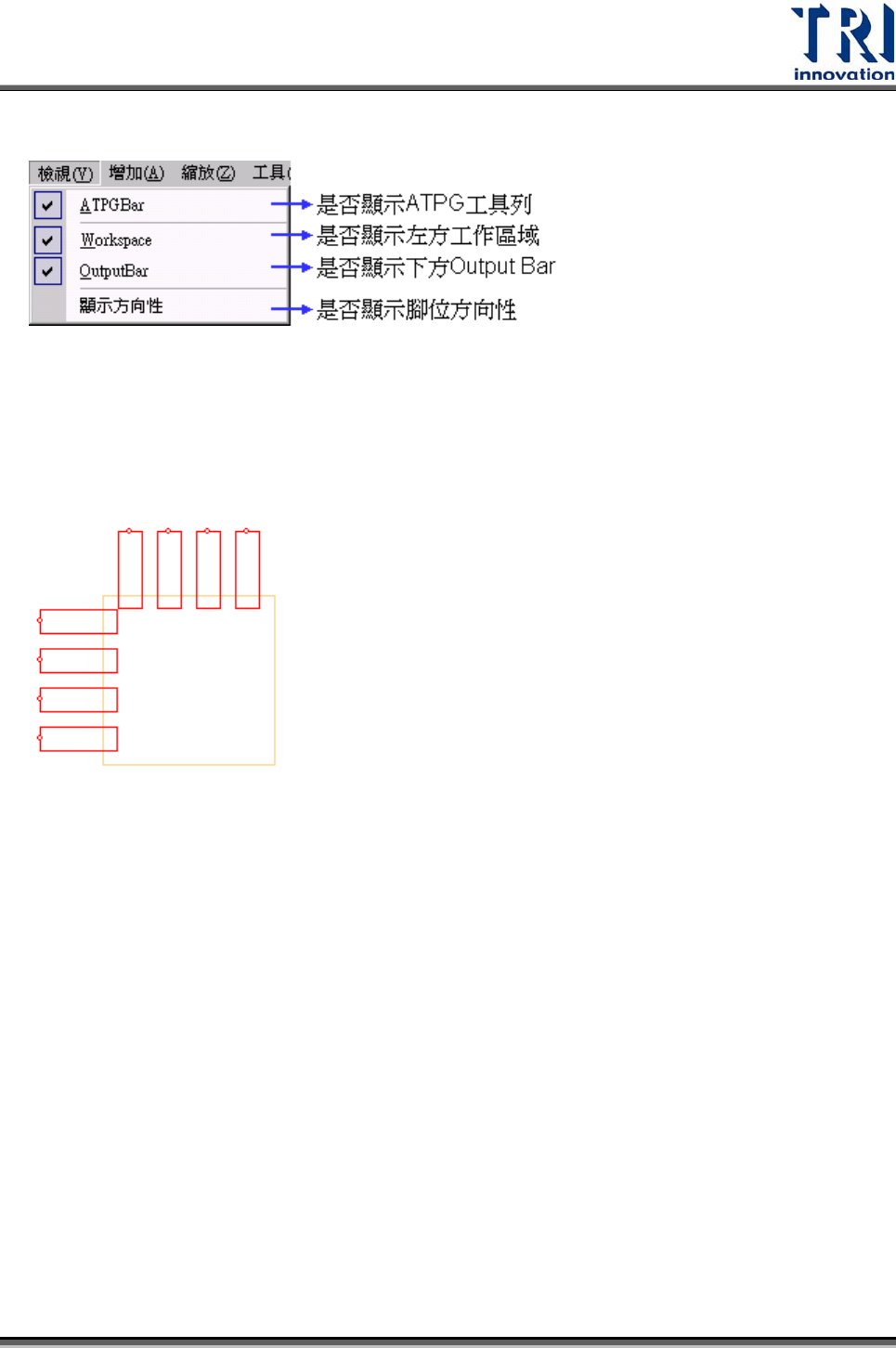Test Research Inc. TR7500SeriesUserGuide – Software 323 4.9.4 檢視 (V IEW ) 4.9.4.1 顯示方向性 (Show Side) 開啟本功能以小圓圈來表示腳位的方向性。正常的方向性如下圖所示,若方向錯誤, 需要按 [ 編輯 / 旋轉方向性 ] 按鈕,來改變腳位的方向。