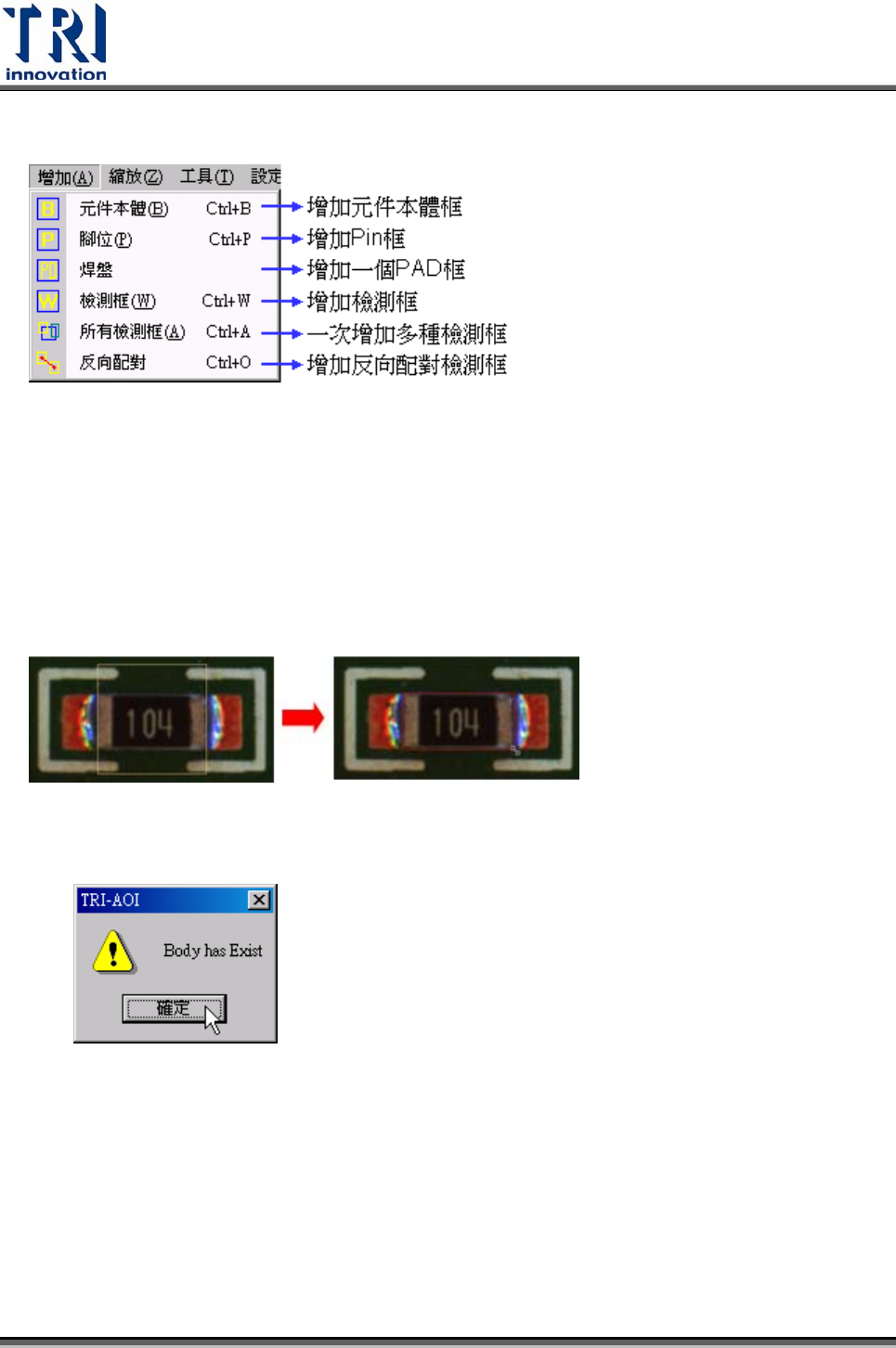 按此按鈕,系統會自動在影像區中央出現一黃色正方形框,即為本體框,元件本體