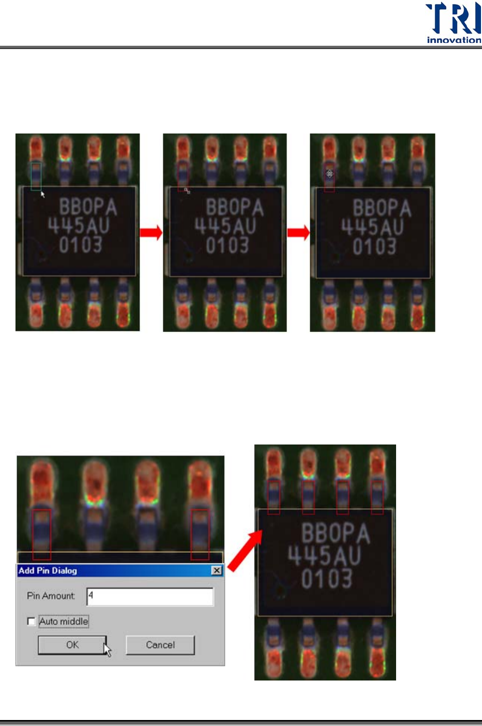 Test Research Inc. 326 TR7500SeriesUserGuide – Software 4.9.5.3 焊盤 (PAD) 增加 PAD 框。 PAD 框無檢測作用,但有建立 PAD 框的元件,在載入資料庫時可以利 用 PAD 長度作為搜尋資訊。 PAD 框的建立方式如下圖,而系統會自動算出露出 PAD 的長度。 4.9.5.4 檢測框 (Window) 按此按鈕後,使用者需在影像區按下滑鼠左鍵並拖曳出一…