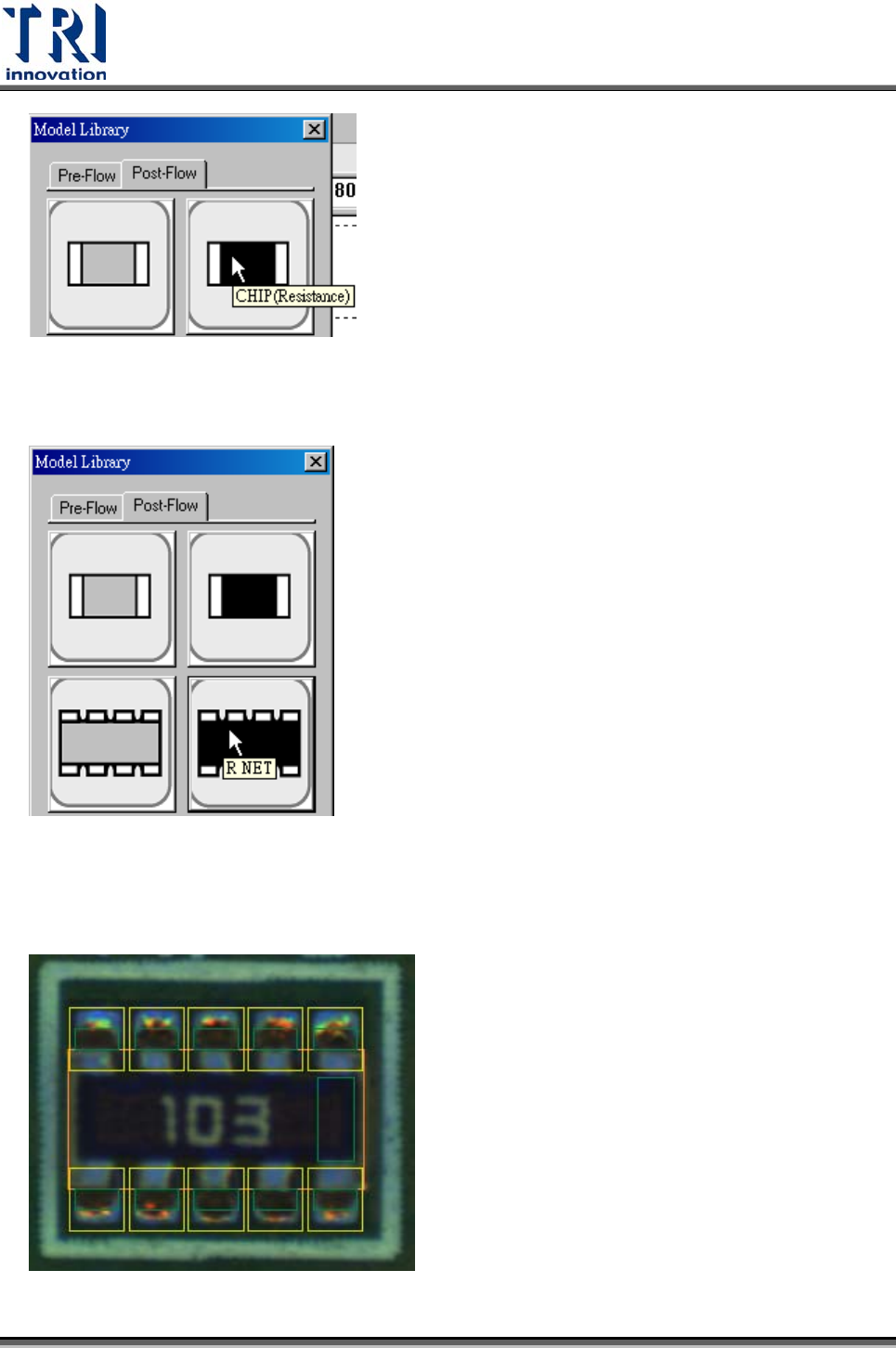 Test Research Inc. 342 TR7500SeriesUserGuide – Software Step8. 點選預套用的模組,本例為 R NET 。 Step9. 出現已建構完成的預設檢測框,如下圖所示。檢測框類型及參數為預設值, 位置及大小依 Body 及 Pin 框決定。
