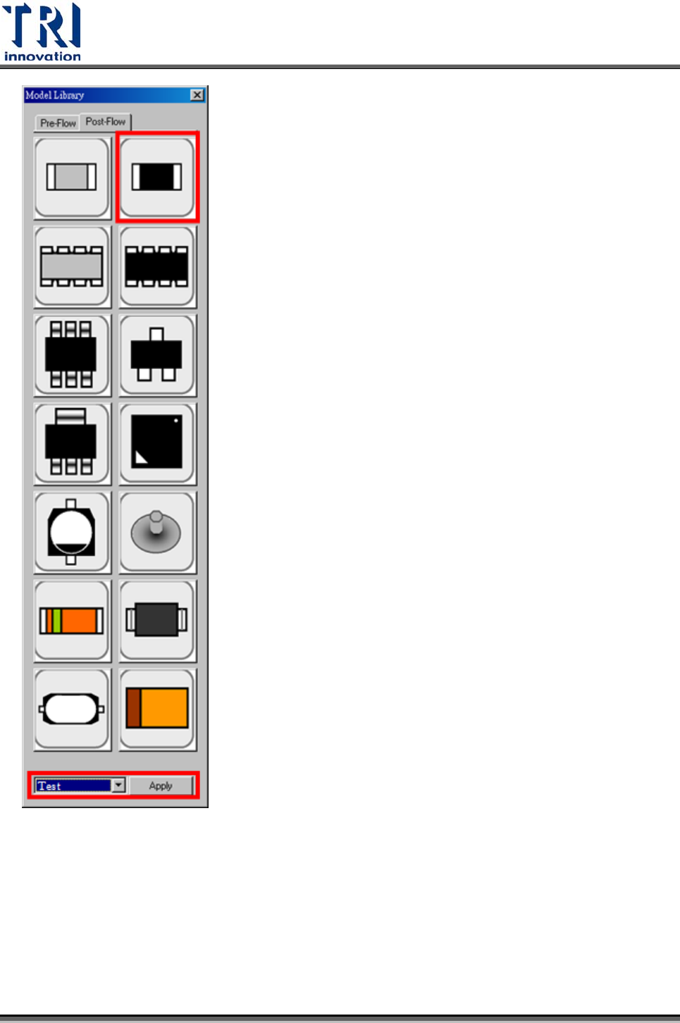Test Research Inc.  TR7500SeriesUserGuide – Software 349 修改已存在的類型 Step1. 勾選 [Tool/ Edit Model Library] 。 Step2. 點選 [Tool/ Model Library] 開啟 Model Library 選擇視窗,選擇一個類型後套 用。 Step3. 對於套用的類型修改其參數。 Step4. 按下 [Tool/ Save …
