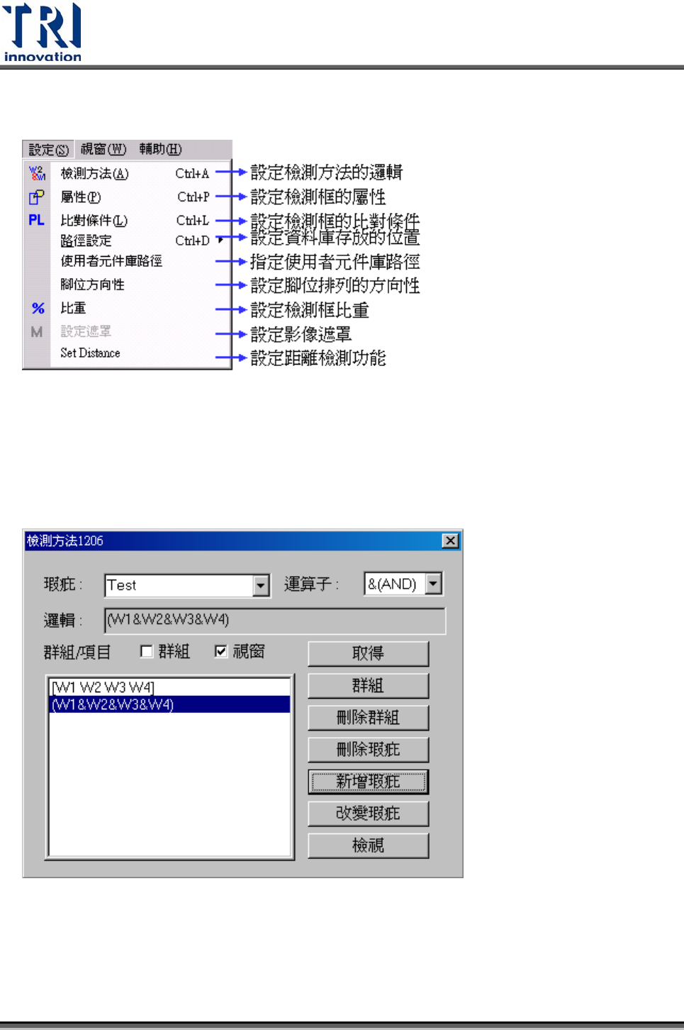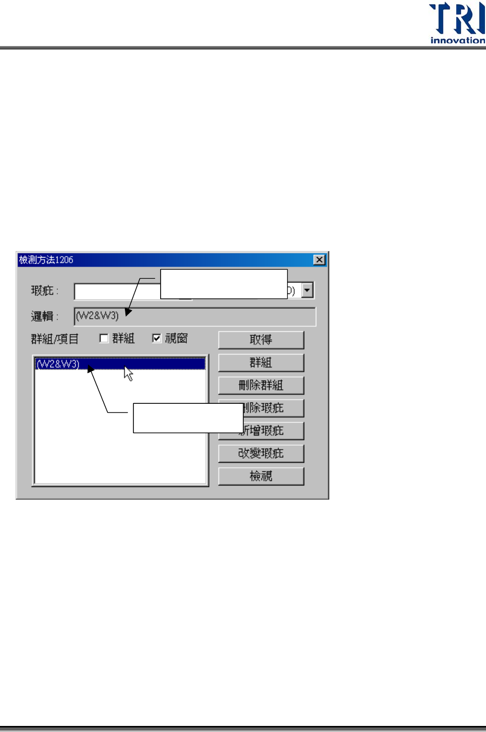 可以使用此視窗建立同一元件不同檢測框之間特殊的邏輯關係。