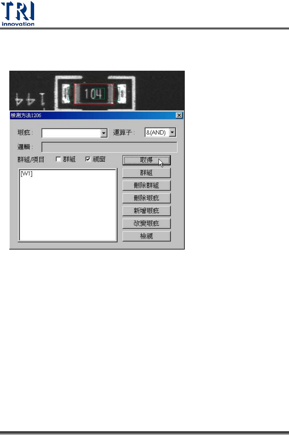 Test Research Inc.  TR7500SeriesUserGuide – Software 353 z &(AND) – 所有以此邏輯連接起來的檢測框全部都通過這個瑕疵的檢查才算通 過。 z |(OR) – 以此邏輯連接起來的檢測框中只要有一個通過,這個瑕疵的檢查就算通 過。 z ^(XOR) – 若兩個以此邏輯連接起來的檢測框檢測結果不相同 ( 一個過一個沒過 ) 則 此瑕疵的檢查才算通過,若結果相同…