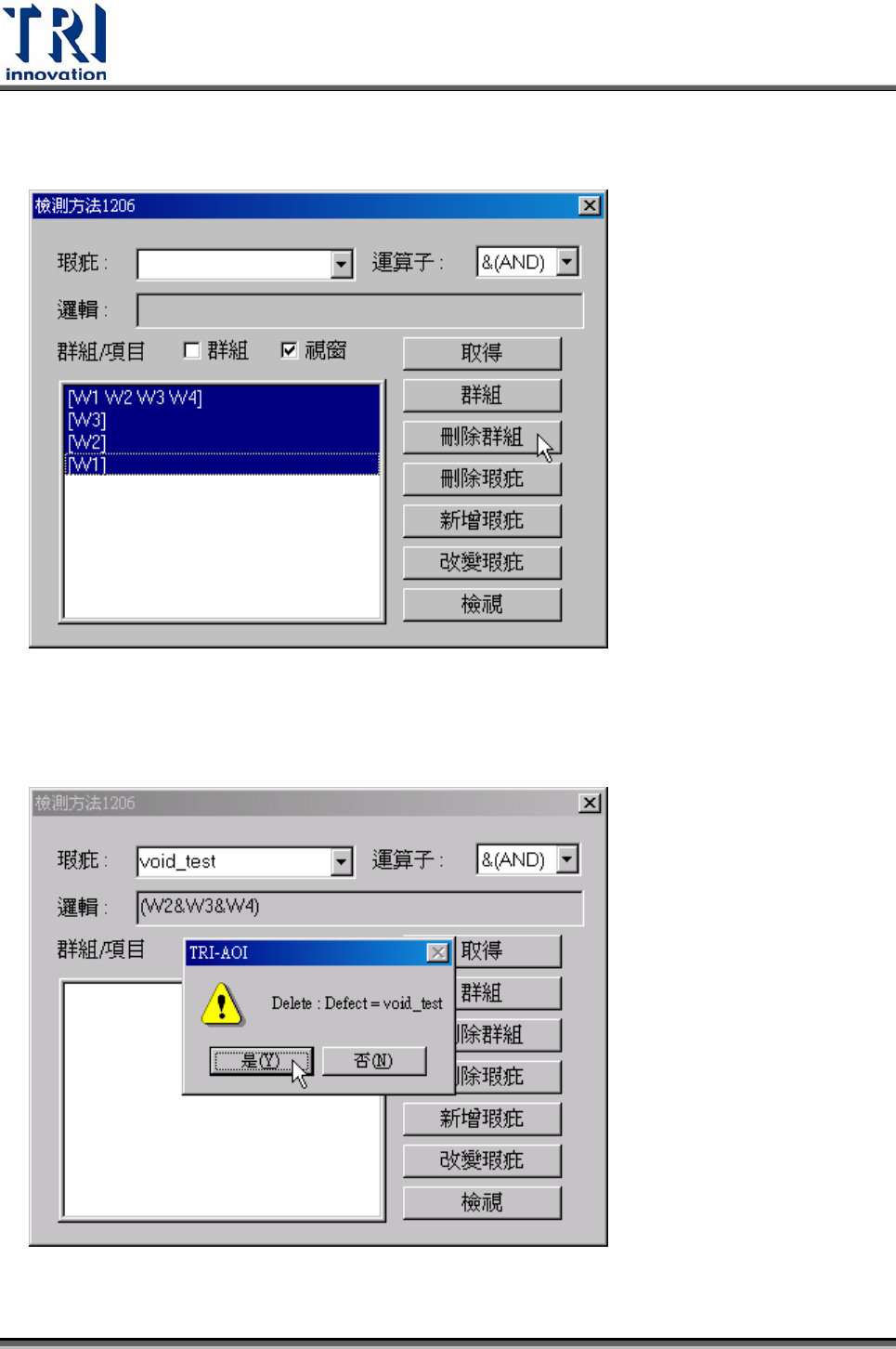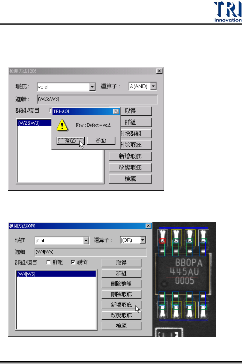 Test Research Inc. TR7500SeriesUserGuide – Software 359 新增瑕疵 (New Defect) – 在下方列表視窗中欲設定的邏輯方程式上按滑鼠左鍵兩 下,可將方程式列在 [ 邏輯 ] 視窗中,接著在 [ 瑕疵 ] 中輸入欲給予的瑕疵名稱,再按下 [ 新增瑕疵 ] ,會出現確認視窗,確定無誤後按 [ 是 ] 即完成設定新瑕疵。若按 [ 否 ] 則不 會設定新瑕疵。 z …