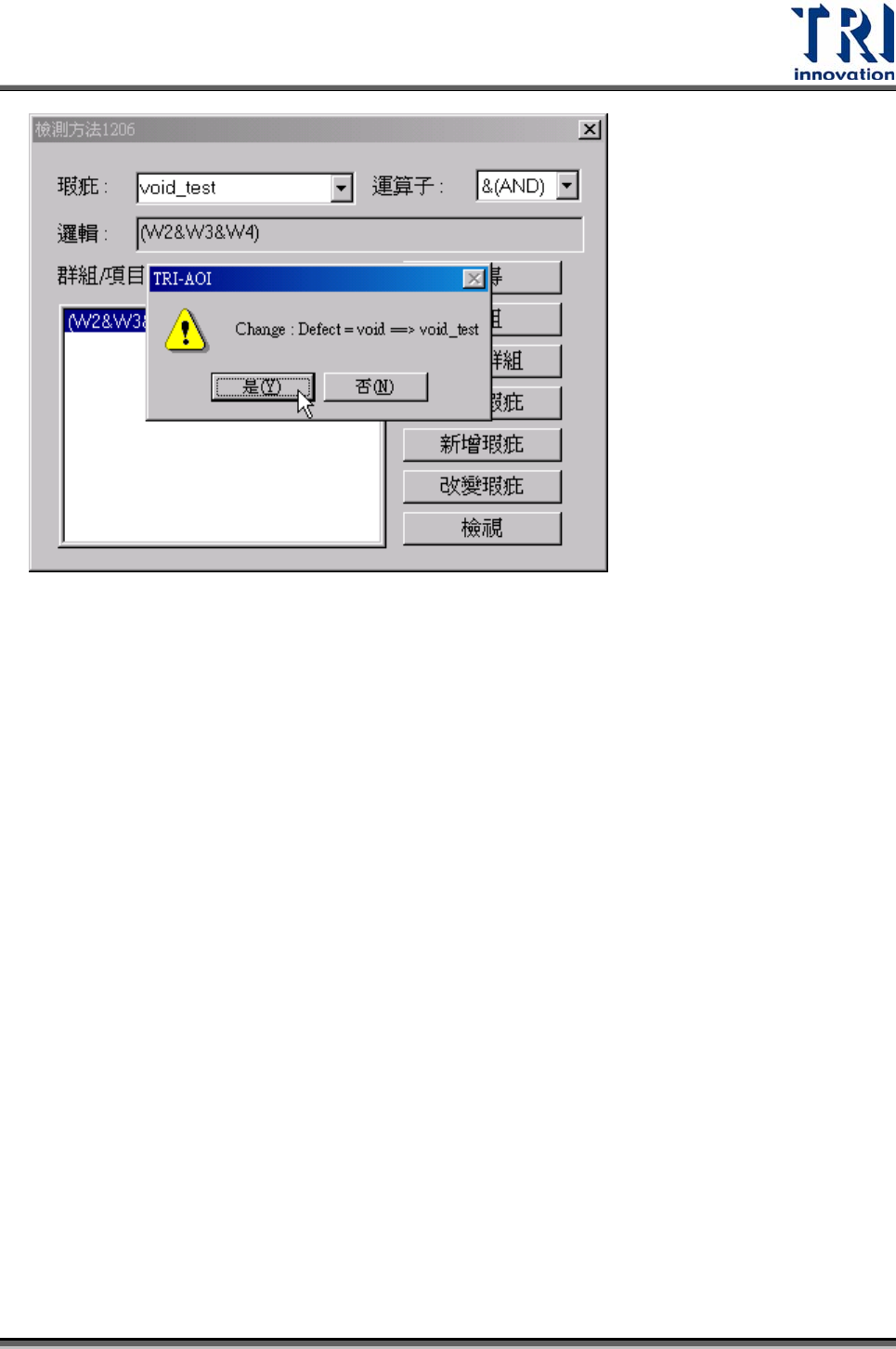 改的部分(瑕疵名稱或邏輯方程式),接著按下[改變瑕疵]會出現確認視窗,確認後按
