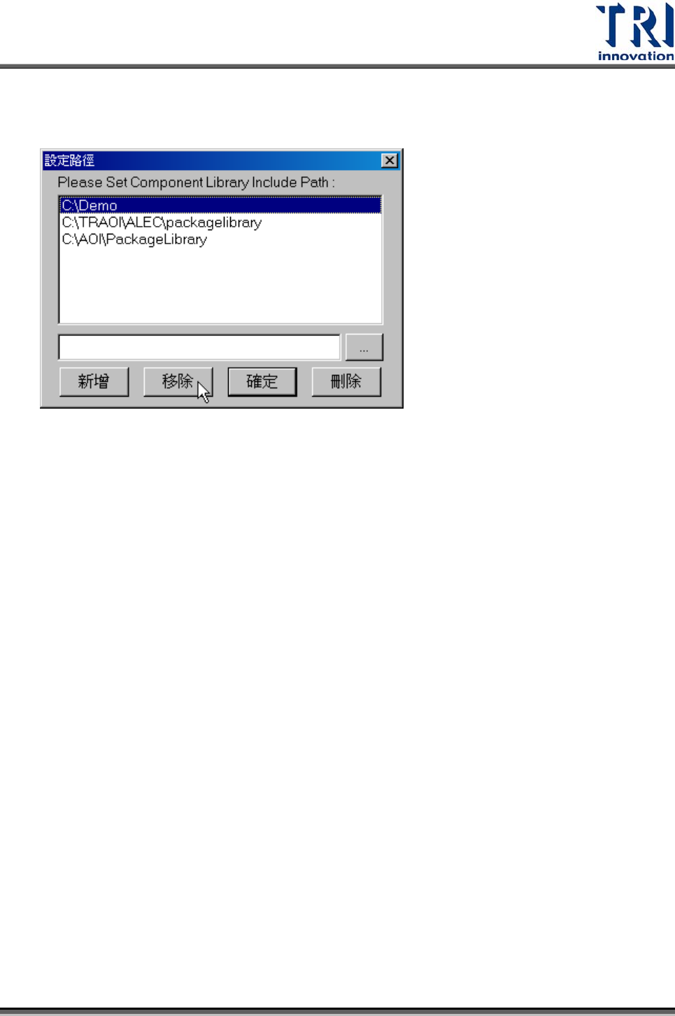 Test Research Inc. TR7500SeriesUserGuide – Software 373 z 移除 – 在路徑列表中選擇欲刪除的路徑後按下 [ 移除 ] ,則可移除此路徑。 z 確定 – 儲存對於路徑的改變並關閉 [ 設定路徑 ] 視窗。 z 取消 – 不儲存對於路徑的任何改變且關閉 [ 設定路徑 ] 視窗。 儲存路徑 – 資料庫在儲存時存入的資料夾路徑。 4.9.8.5 使用者元件庫路徑 (Us…
