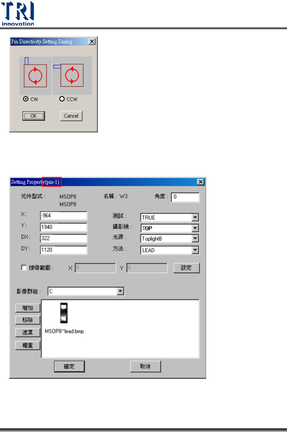 在屬性視窗可以看到選擇的檢測框所代表的 IC腳號碼。(pin-1)表示該檢測框不為任何