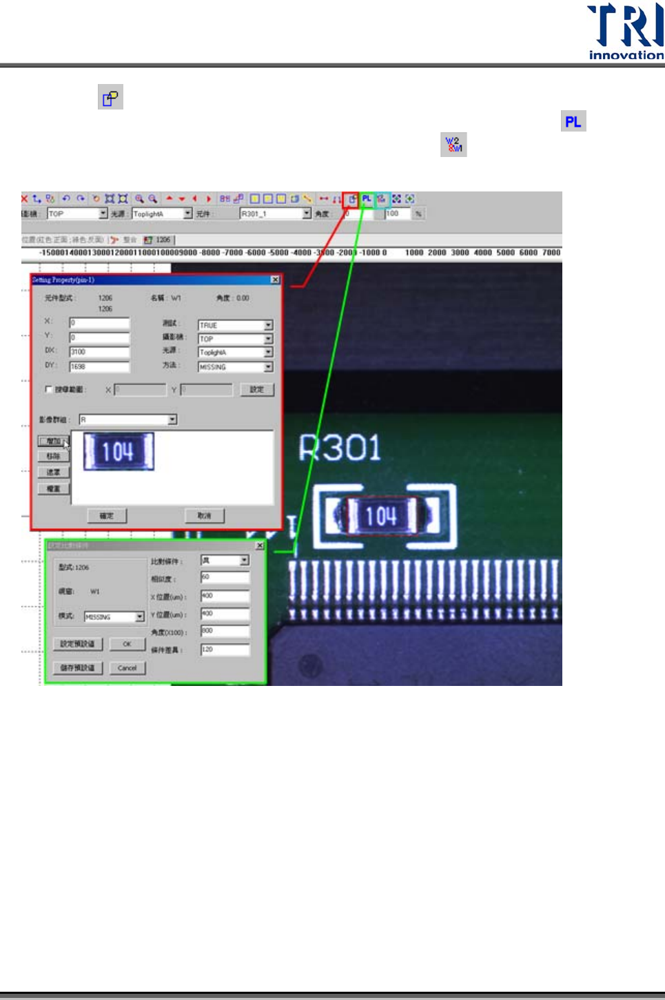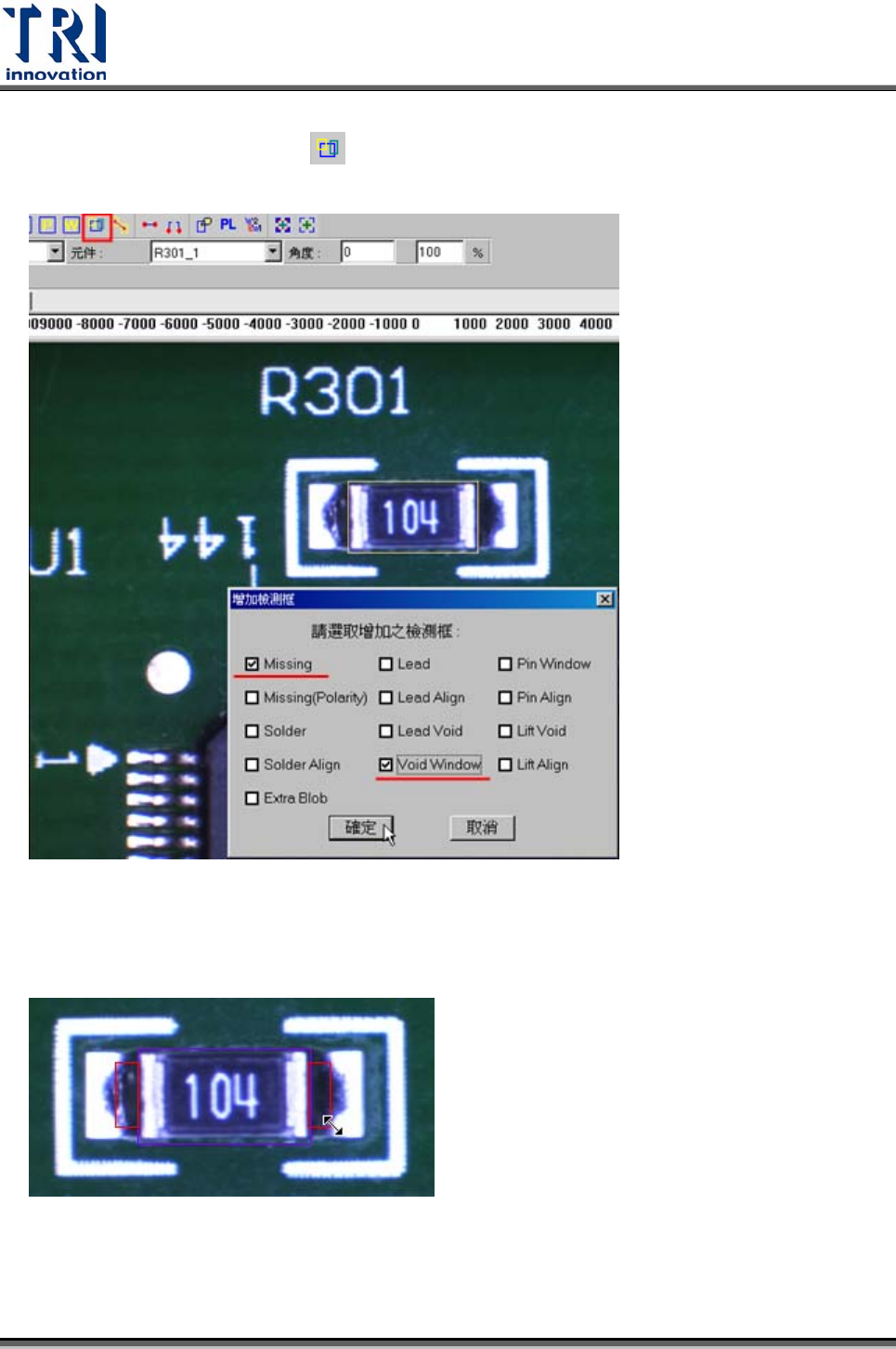 Test Research Inc. 384 TR7500SeriesUserGuide – Software 3) 增加所有檢測框:按下 [ Add all] 按鈕,出現增加檢測框視窗。在此選擇 [Missing] 及 [Void Window] 兩種,接著按下 [ 確定 ] 。 4) 所產生的 [Missing] 框會產生在 [Body] 框上方,而兩個 [Void Window] 會分別產生在 [Body] 框的兩個短邊…
